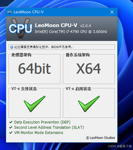 这里给大家介绍一款工具LeoMoon CPU-V, 它是一个非常简单实用的CPU工具,可以用来检测cpu虚拟化是否开启,打开软件即可看到详细参数,只需要运行软件,就能够自动检测硬件是否支持虚拟化,还能查看处理器构架、操作系统构架、vt支持状态和vt启用状况
