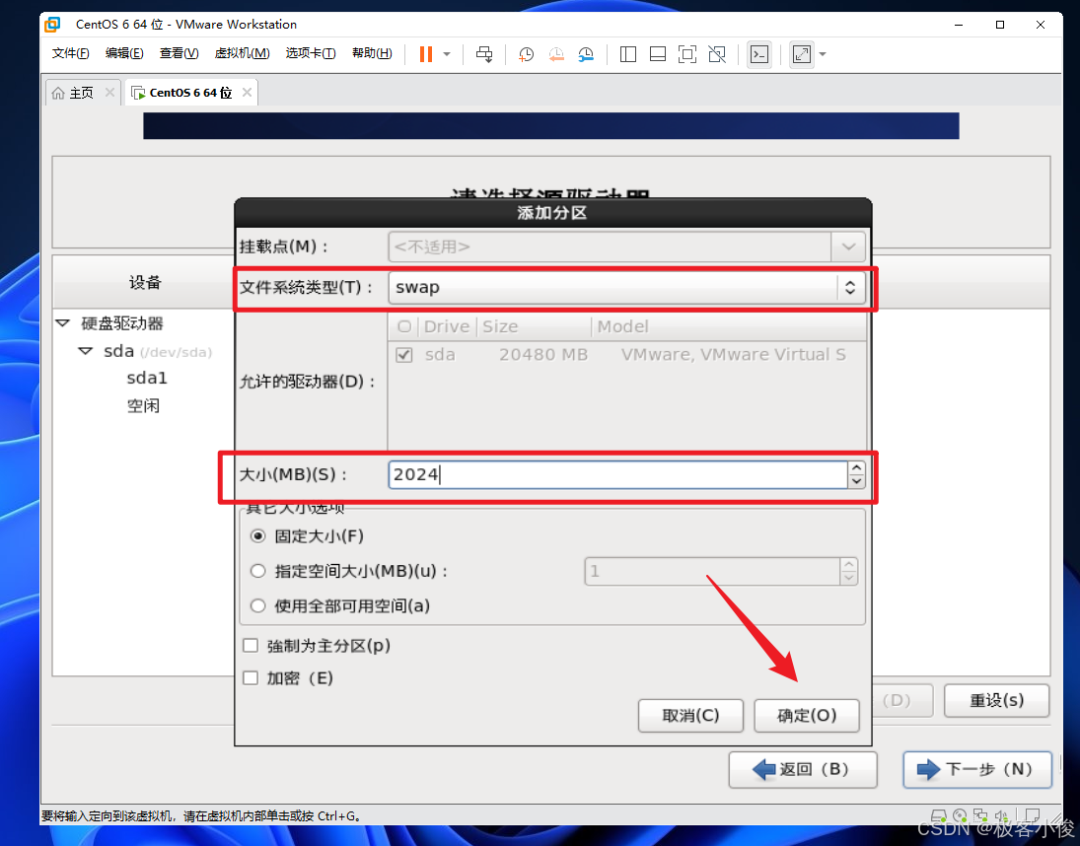 不同的是,这里选择文件系统类型为swap,大小我指定的2024MB, 点击确定!