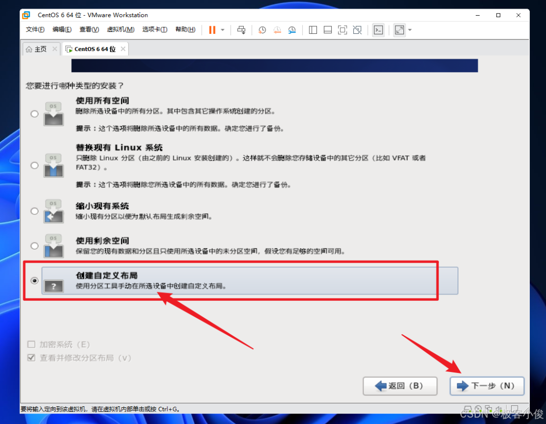 跟我们安装Windows系统一样,安装CentOS我们也要对虚拟的硬盘进行分区,如果不明白也没关系,跟着我的步骤来操作就可以了, 这里选择创建自定义布局