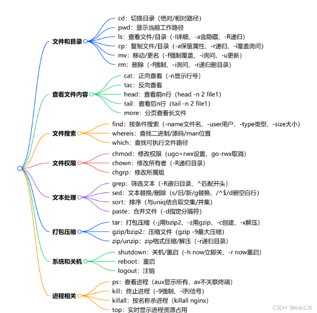 本文汇总了运维人员常用的 Linux 命令,涵盖文件和目录操作(如 cd、ls、cp、mv、rm)、文件内容查看(如 cat、head、tail、more)、文件搜索(如 find、whereis、which)、文件权限管理(如 chmod、chown、chgrp)、文本处理(如 grep、sed、sort)、打包压缩(如 tar、gzip、zip)、系统和关机(如 shutdown、reboot)及进程相关(如 ps、kill、top)八大类。其中,chmod 用于修改权限,ps 和 kill 用于进程管理,tar 支持多种压缩格式是关键内容,命令参数(如 cp -r、rm -r、chmod ugo+rwx)对功能实现起重要作用。