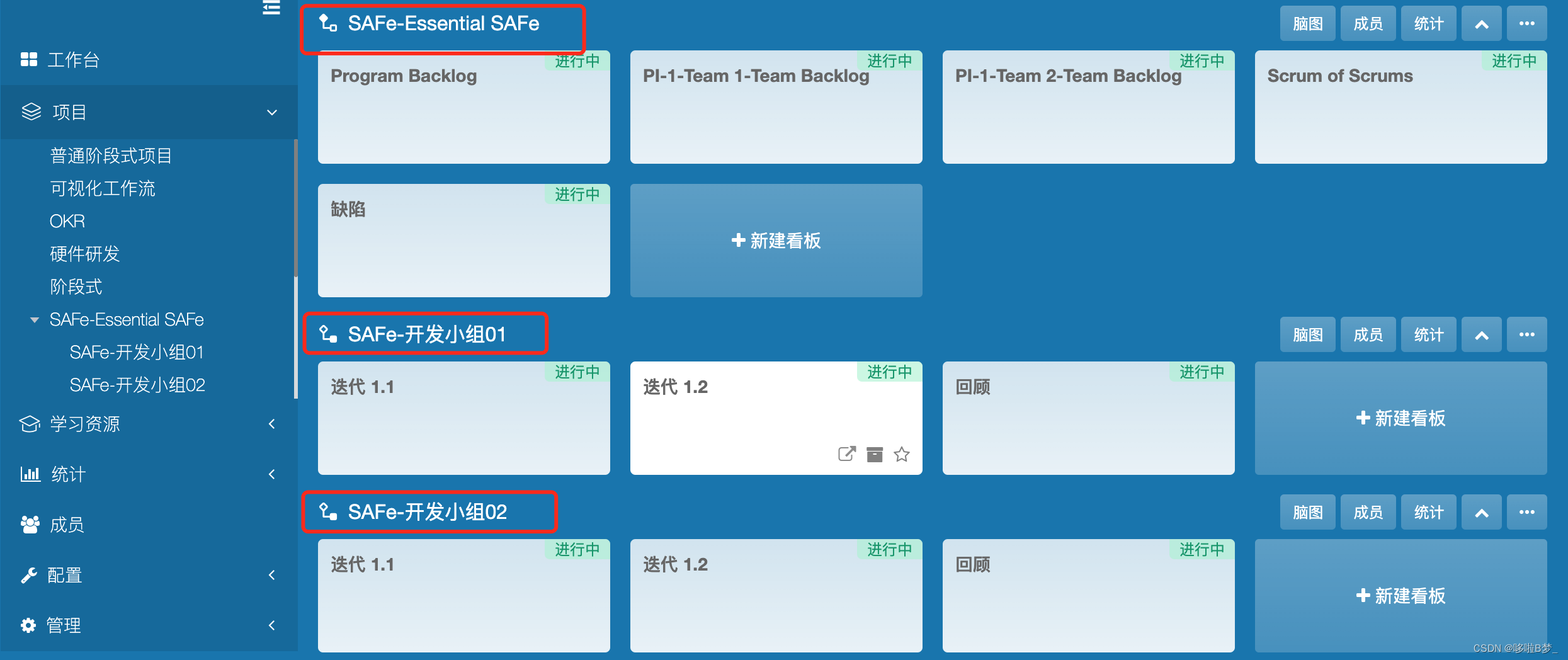 SAFe-Essential SAFe父项目内可以查看每个PI的进度和缺陷分布以及每个开发小组的团队速率等等。每个 safe开发小组内都有单独的统计,团队速率,迭代完成率、工作分布等。可以体验下。