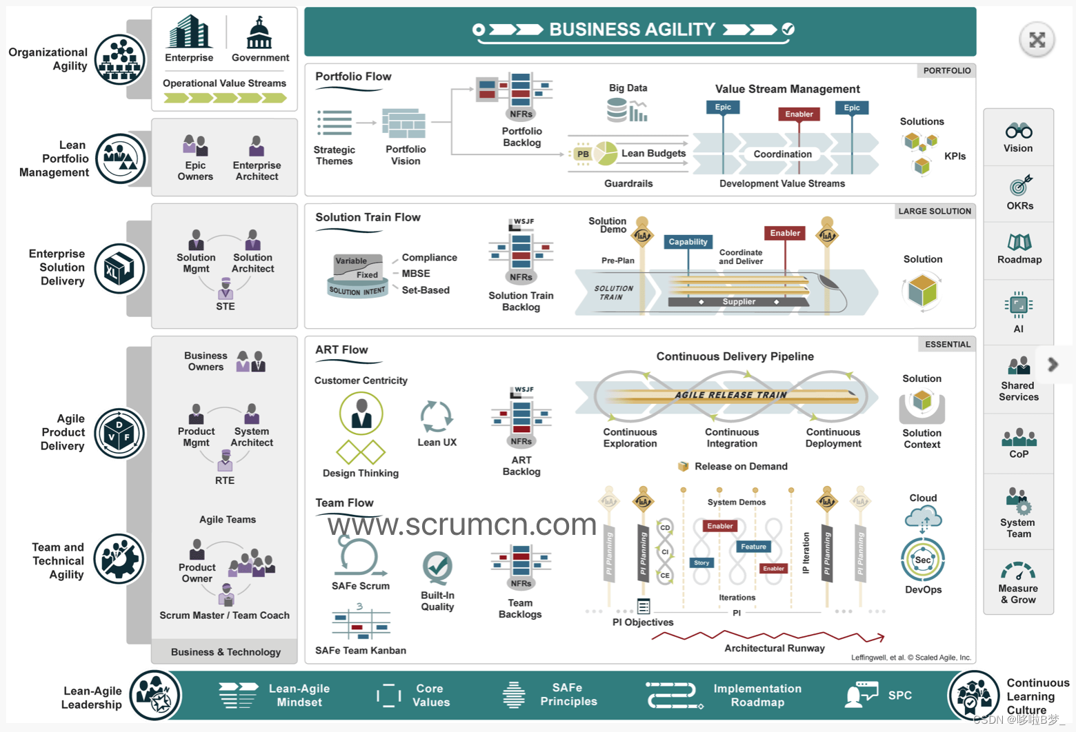 SAFe由Dean Leffingwell创建,从2011年发布的SAFe1.0开始,到目前已经演进到了SAFe6.0版本。以下是SAFe框架的大图: