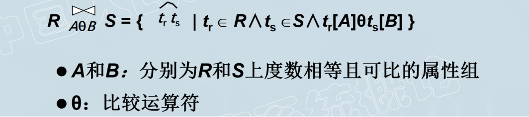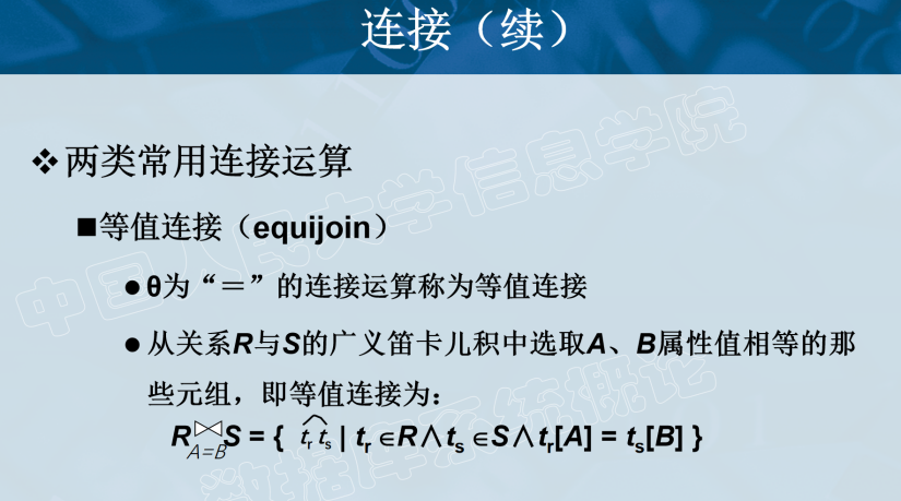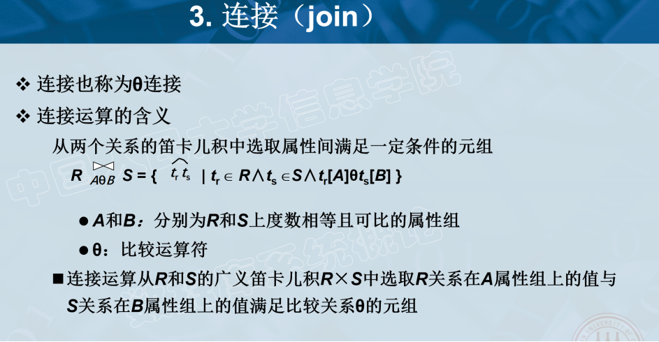 连接(Join):将两个关系中的元组按照一定的条件拼接成一个新的关系。