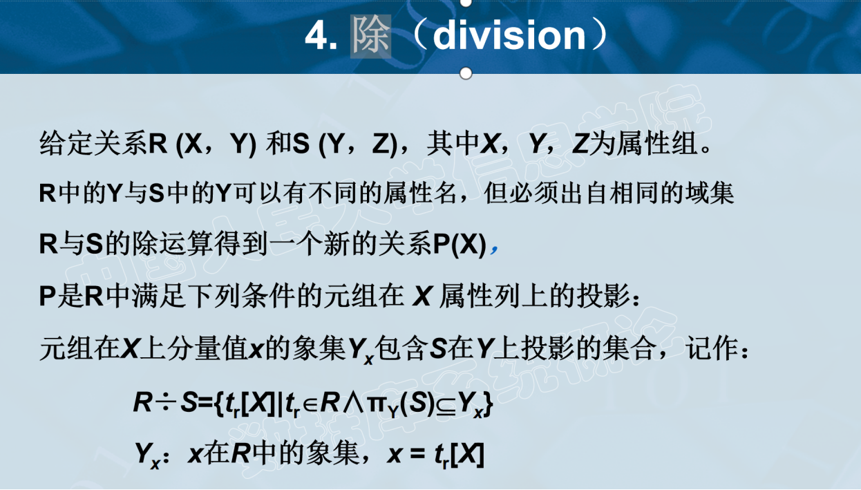 除(Division):类似于数学中的除法,用于确定一个关系在另一个关系中的所有可能组合。