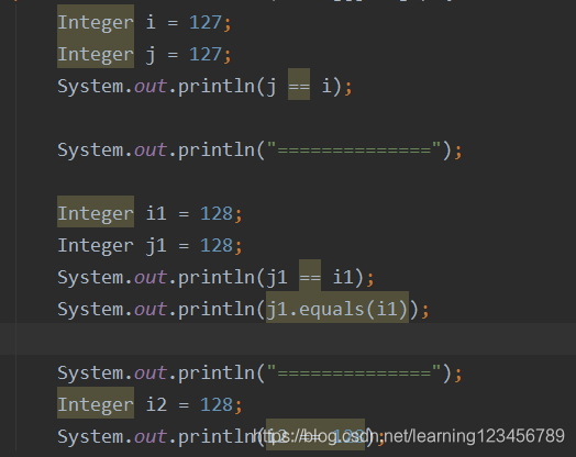 Integer在类加载的时候已经缓存了-128-127大小的数据,所以i==j;i1和j1因为不在缓存范围,相当于重新new了两个数据,所以i1,j1的==比较为false。