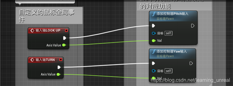 根据上三图,不难发现一个共有的,最常被使用的东西——pawn。我不放官方解释,发表一下我经过不断实验得出的个人见解。不过在这之前,先看一个UE4中封装好的用来获取鼠标运动并输出轴值给“pawn”的函数。(“pitch”可以替换为‘yaw’或者‘roll’)