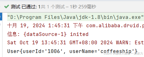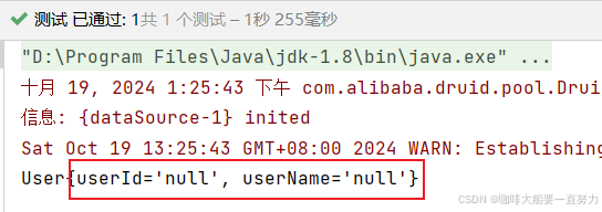 这里有一个问题,返回的User对象属性都为空,这是因为数据库中的字段名和类的属性不一致造成的,User实体类中是setUserId和setUserName,jdbcTemplate就会找字段名为user_id和user_name的属性值,将其注入,但没有找到,因为数据库中的字段名是id和name。