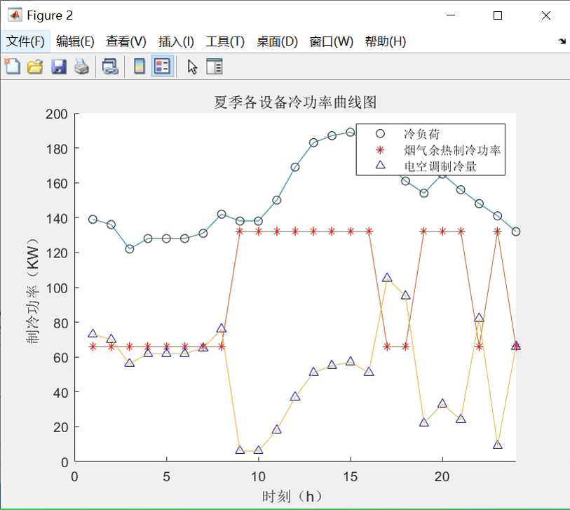 - 图2:夏季各设备冷功率曲线(冷负荷、烟气余热制冷、电空调制冷)