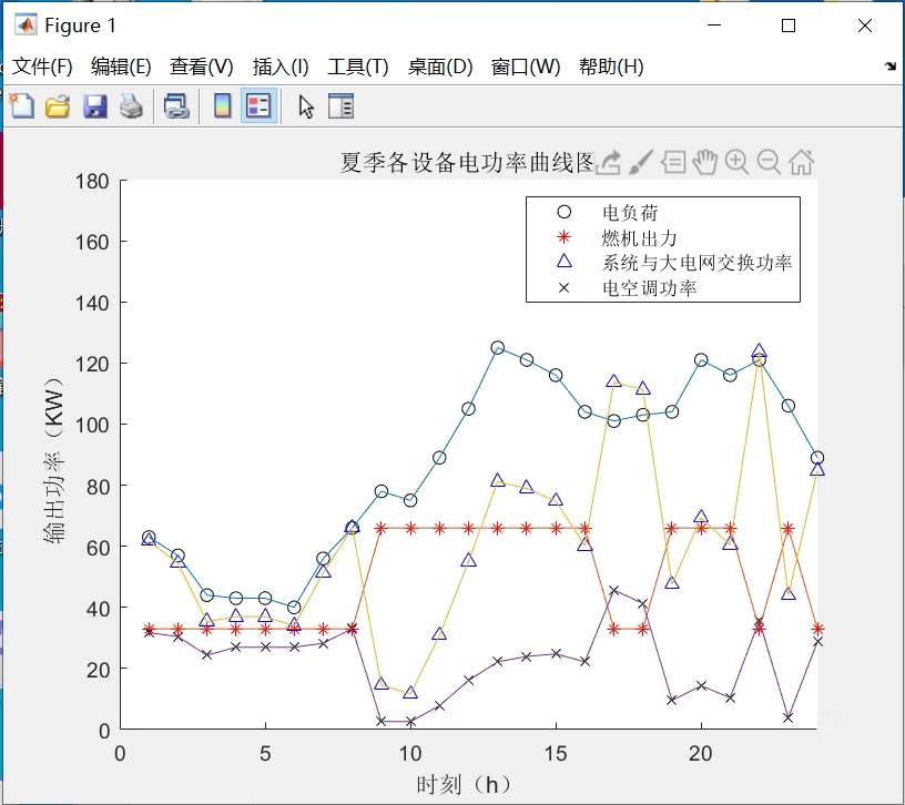 - 图1:夏季各设备电功率曲线(电负荷、燃机出力、电网交换功率、电空调功率)