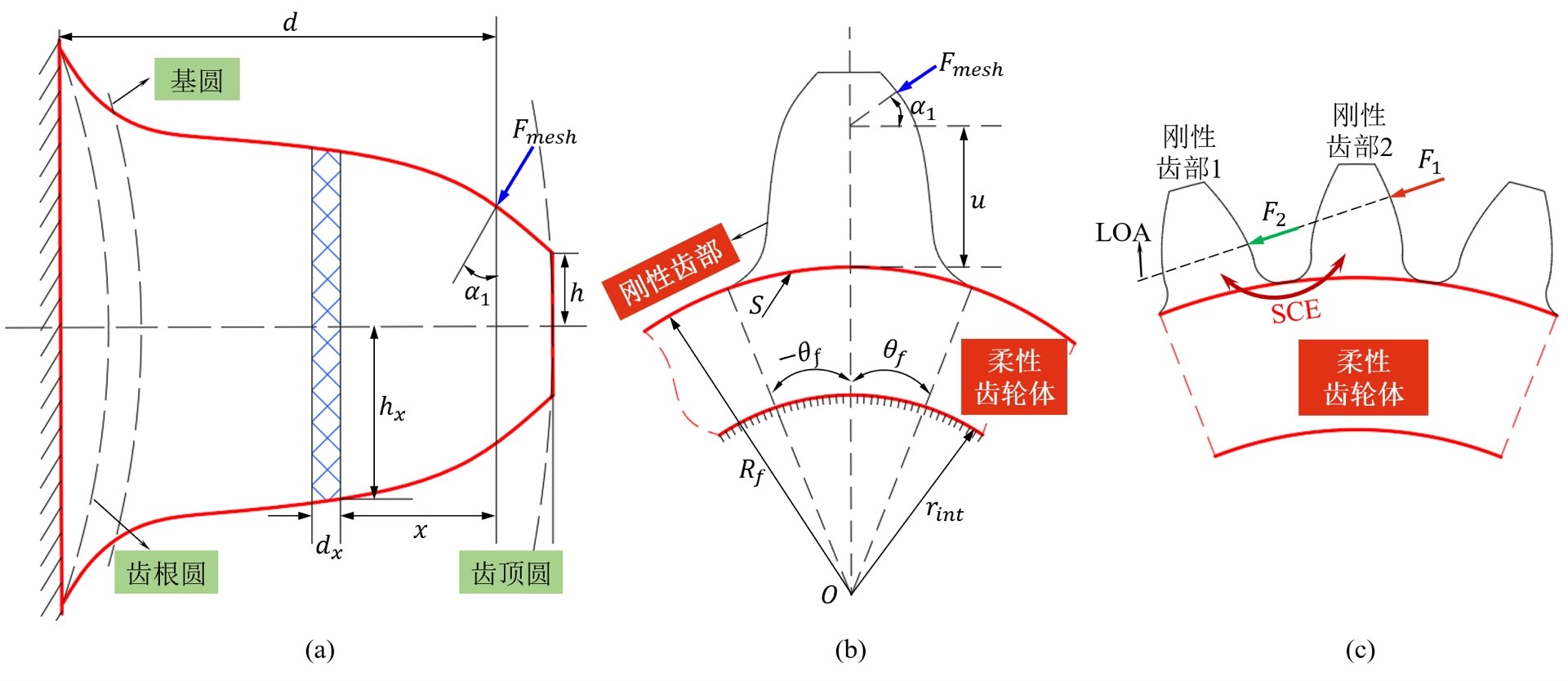 传统模型将齿根简化为基圆起始的悬臂梁,忽略了齿根圆与基圆之间的过渡区域。本文通过分段积分方法,分别计算基圆以上和基圆以下部分的变形能,显著提高了刚度计算精度。
