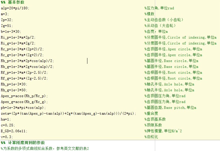 该MATLAB程序用于计算直齿轮的时变啮合刚度,考虑了齿轮啮合过程中的多种力学因素,包括赫兹接触刚度、弯曲刚度、剪切刚度、轴向压缩刚度和基体刚度等。程序特别设计了是否考虑摩擦系数的选项,为齿轮系统动力学分析提供了重要的刚度参数。
