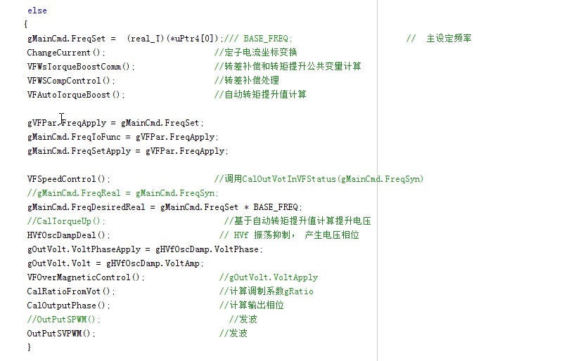 该代码实现了一个基于SVPWM(空间矢量脉宽调制)的VVVF控制系统,支持多种V/F曲线、自动转矩提升、转差补偿、振荡抑制等功能。系统采用模块化设计,包含电流变换、电压频率控制、PWM生成等子模块。