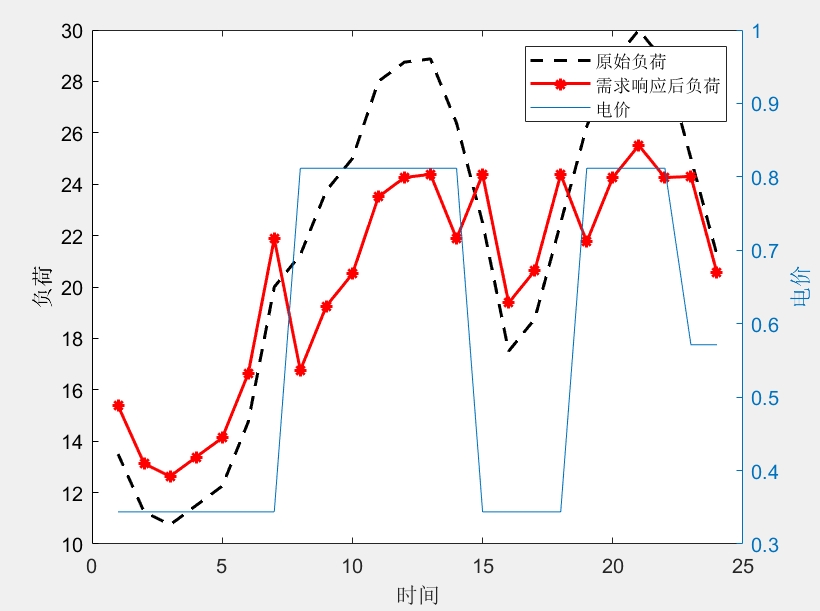 最后,代码通过绘图直观地对比了需求响应前后的负荷曲线,并在同一图中展示了分时电价的变化,清晰地呈现了电价信号如何有效引导负荷从高峰时段向平、谷时段转移,从而达到“削峰填谷”的优化目标。