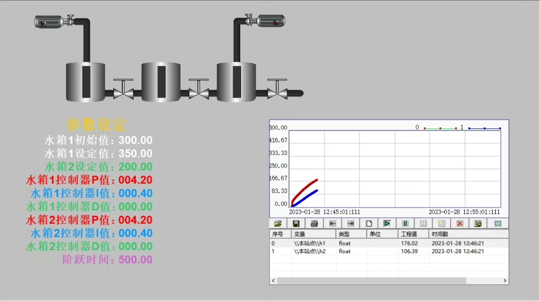 - 添加仪表显示:添加数值显示控件,用于实时显示各个水箱的液位值。同样通过动画连接,将控件的显示值与对应的液位变量绑定。