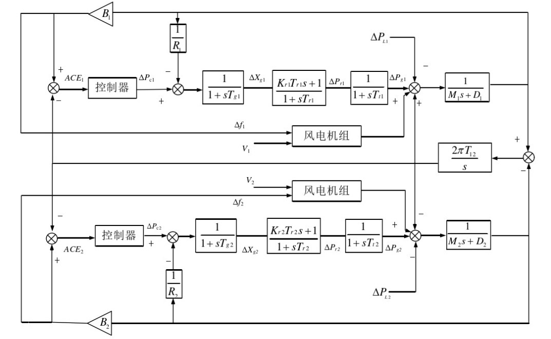自动发电控制(AGC)调频模型是二次调频控制的核心部分。该模型能够根据电力系统的实时运行状态,自动调整发电机的输出功率,以实现频率的稳定。在含风电的两区域系统中,AGC模型需要考虑到风电的预测信息,以及不同区域之间的功率交换。