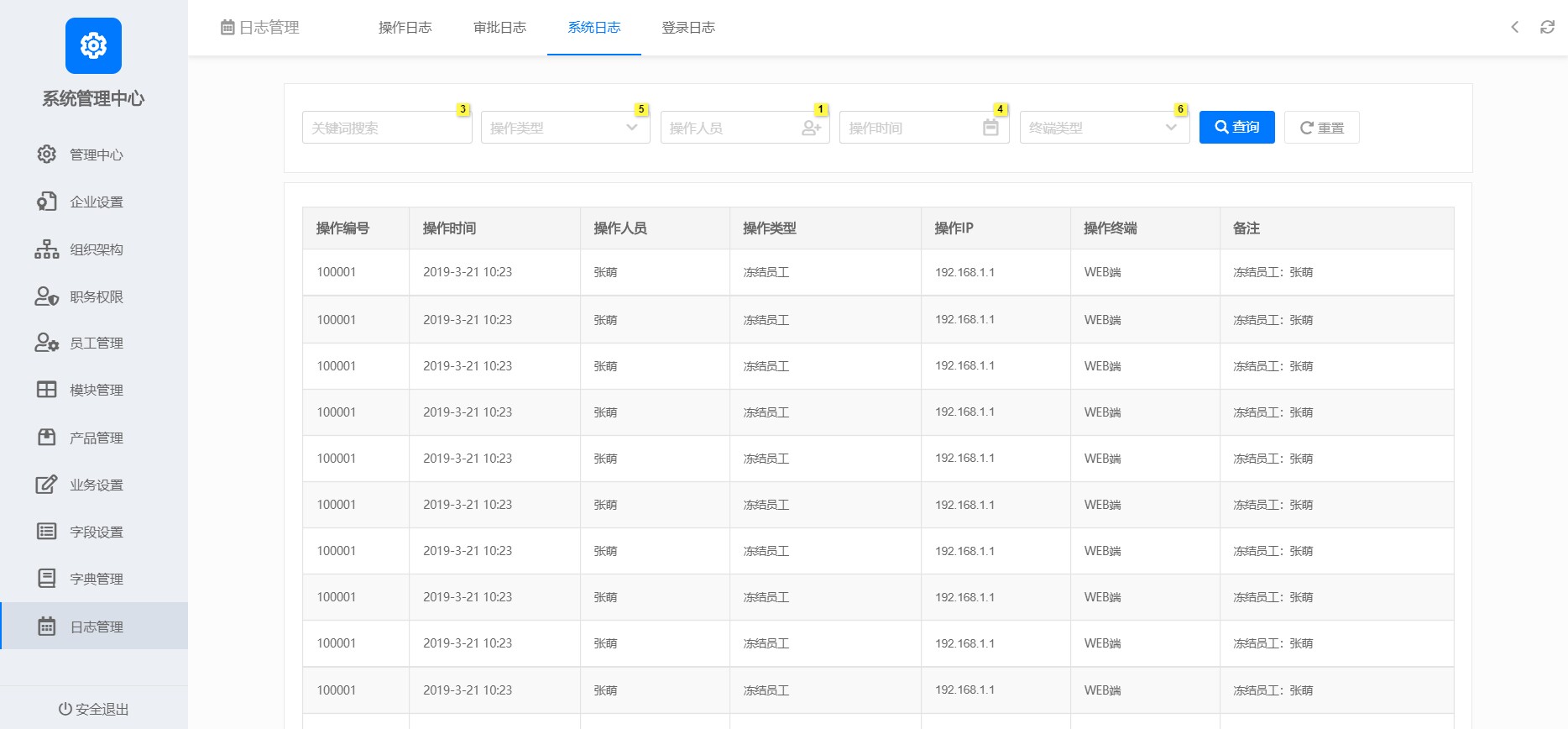 CRM后台原型模板 #产品原型#Axure# 文件大小6.21M,系统业务分为12个核心模块:管理中心、系统公告、企业设置、组织架构、职务权限、员工管理、模块管理、产品管理、业务设置、字段设置、字典管理、日志管理等。 对于想做产品的同学或者想深入了解CRM后台系统的朋友,极具研究学习价值和办公使用价值! 致力于让产品人专注产品本身,不受原型实现的困扰~ 适合人群:互联网产品经理、学习使用axure的同学
