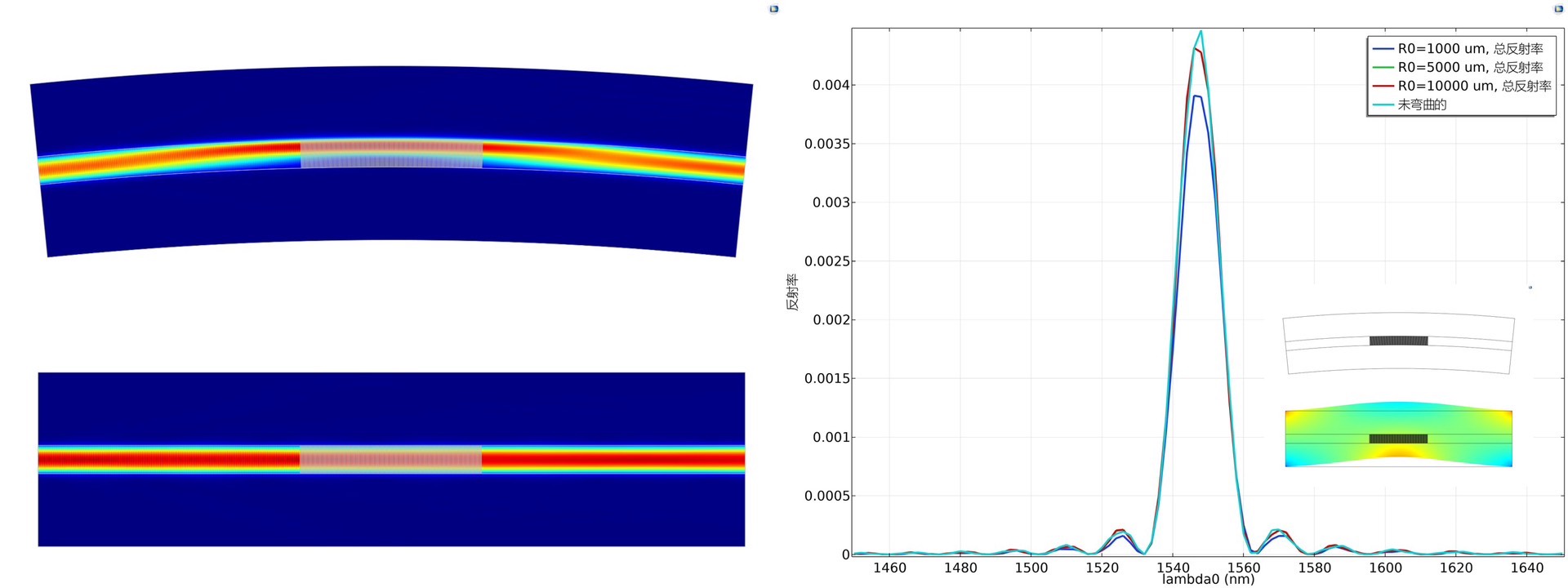 实际操作时直接在结果里提取最大反射率对应的波长就行。跑完仿真记得对比文献数据,正常弯曲导致的波长漂移量级在0.1~1nm之间,要是算出5nm肯定哪里翻车了。