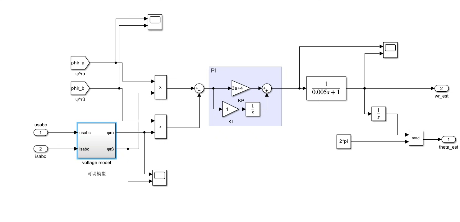 这个模型包含了磁链环PI、转速环PI和电流环PI。PI控制器是经典的控制算法啦,在很多控制系统里都能看到它的身影。磁链环PI的作用是对电机的转子磁链进行控制,并且它还可以切换成开环模式。转速环PI负责控制电机的转速,让电机能够按照我们设定的转速来运行。电流环PI则是对电机的电流进行调节,保证电机的电流稳定。