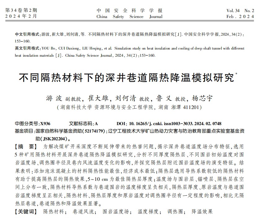 COMSOL不同隔热材料对巷道通风降温影响的数值模拟研究 模型简介:基于COMSOL软件复现CSCD核心(游波,崔大雄,刘何清,等.不同隔热材料下的深井巷道隔热降温模拟研究[J].中国安全科学学报,2024,34(02):153-160.),研究隔热材料对水平巷道通风降温影响的数值模拟 模型特色:采用湍流、流体传热、固体传热模型对水平巷道、围岩、锚喷层、隔热层4层介质进行传热模拟,以分析巷道不同断面的降温效果 COMSOL6.2版本