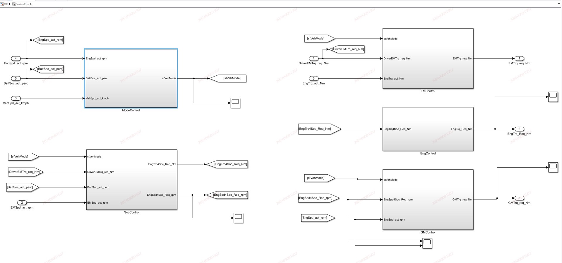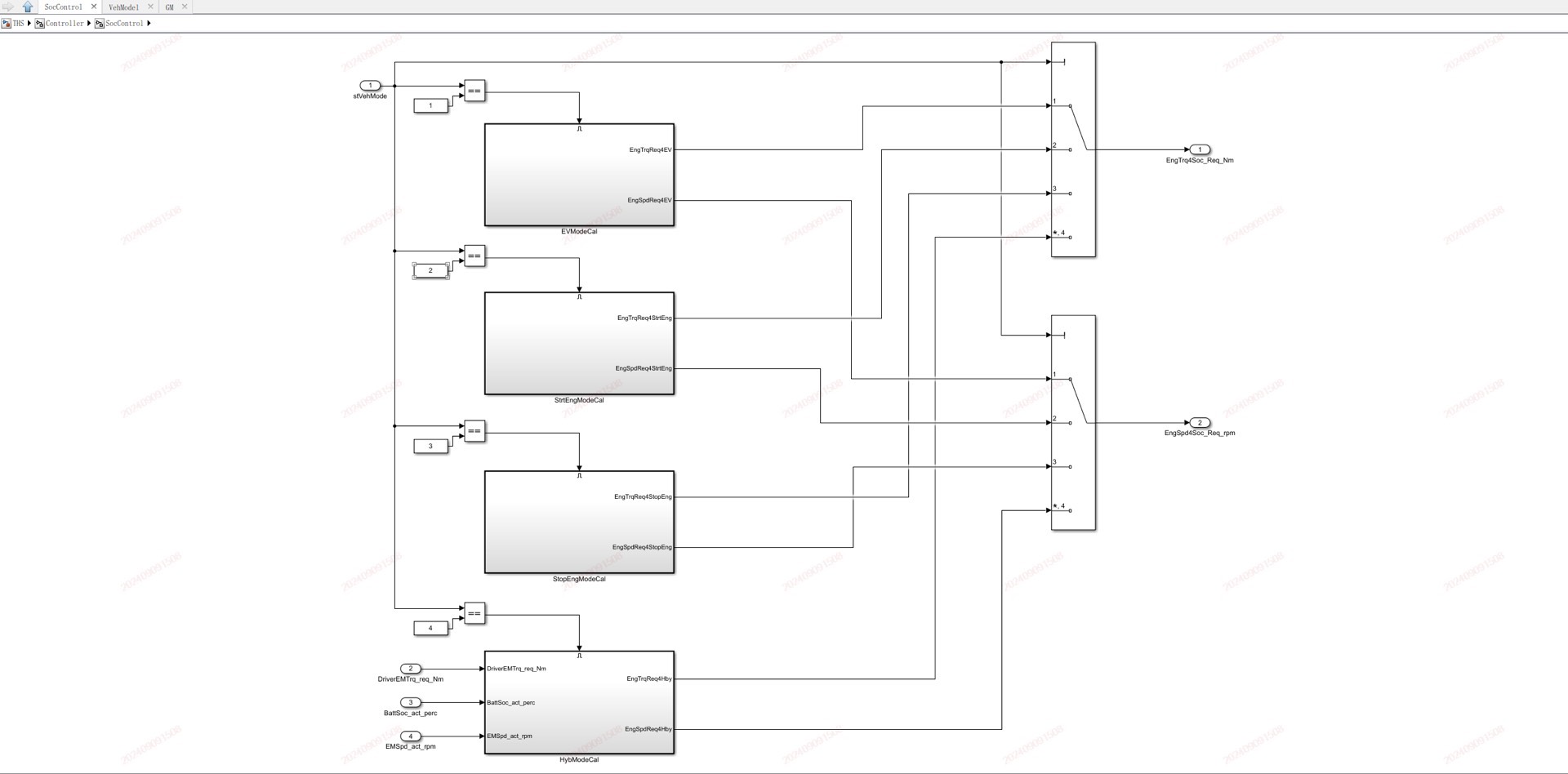 说到能量管理策略,这个模型最骚的操作是复刻了THS的实时扭矩分配算法。在VCU里有个状态机模块,会根据踏板开度和SOC切换五种模式: