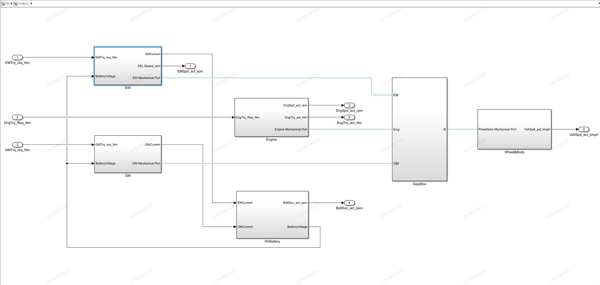 先拆解整个模型的骨架——整个系统像俄罗斯套娃似的分了三层:最底层是发动机(ECU)、MG1/MG2双电机(MCU)、电池(BMS)这些硬件模型;中间夹着行星齿轮这个传动魔术师;最上层则是VCU指挥官拿着能量管理策略当令箭。重点说几个魔鬼细节: