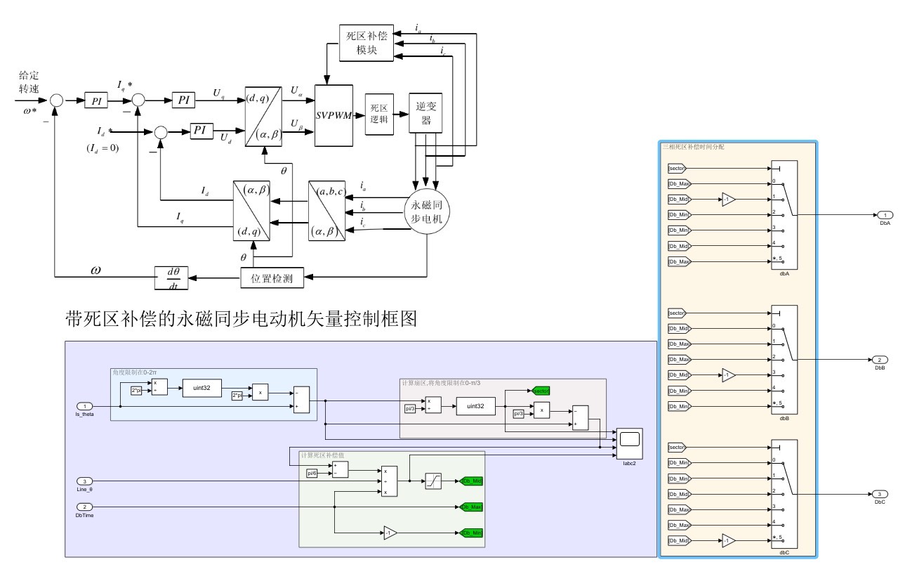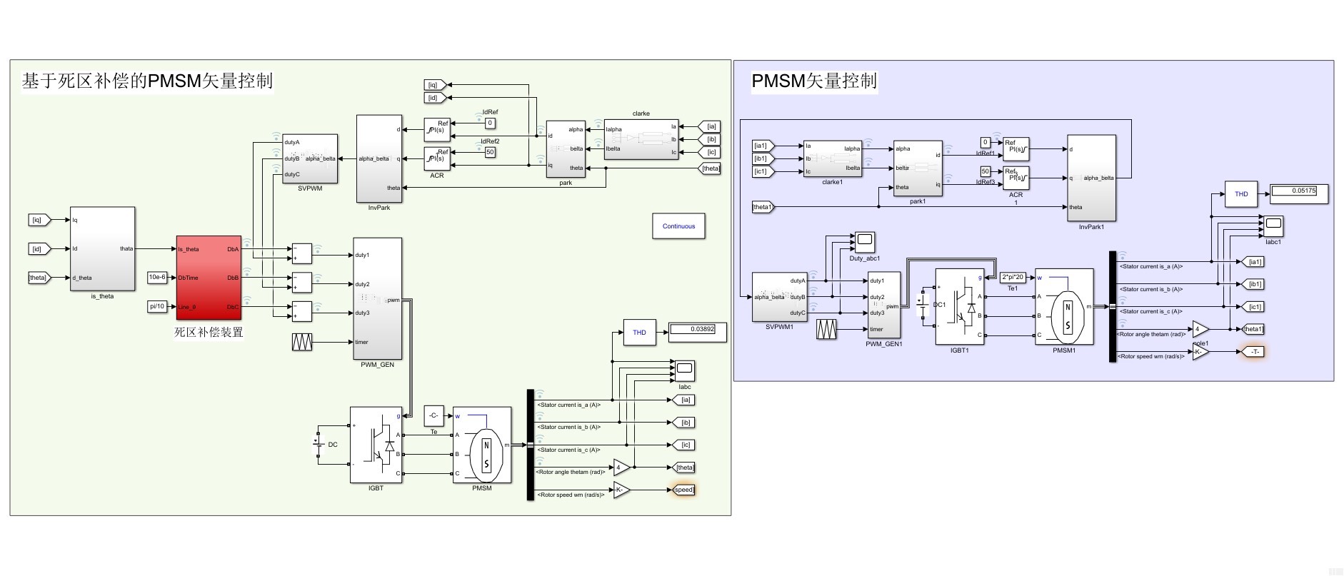 为了更直观地了解死区补偿的效果,我们搭建了两套系统进行仿真。一套是使用死区补偿的PMSM矢量控制系统,另一套则是未使用死区补偿的系统。这就像一场对比实验,能让我们清晰地看到死区补偿前后的差异。