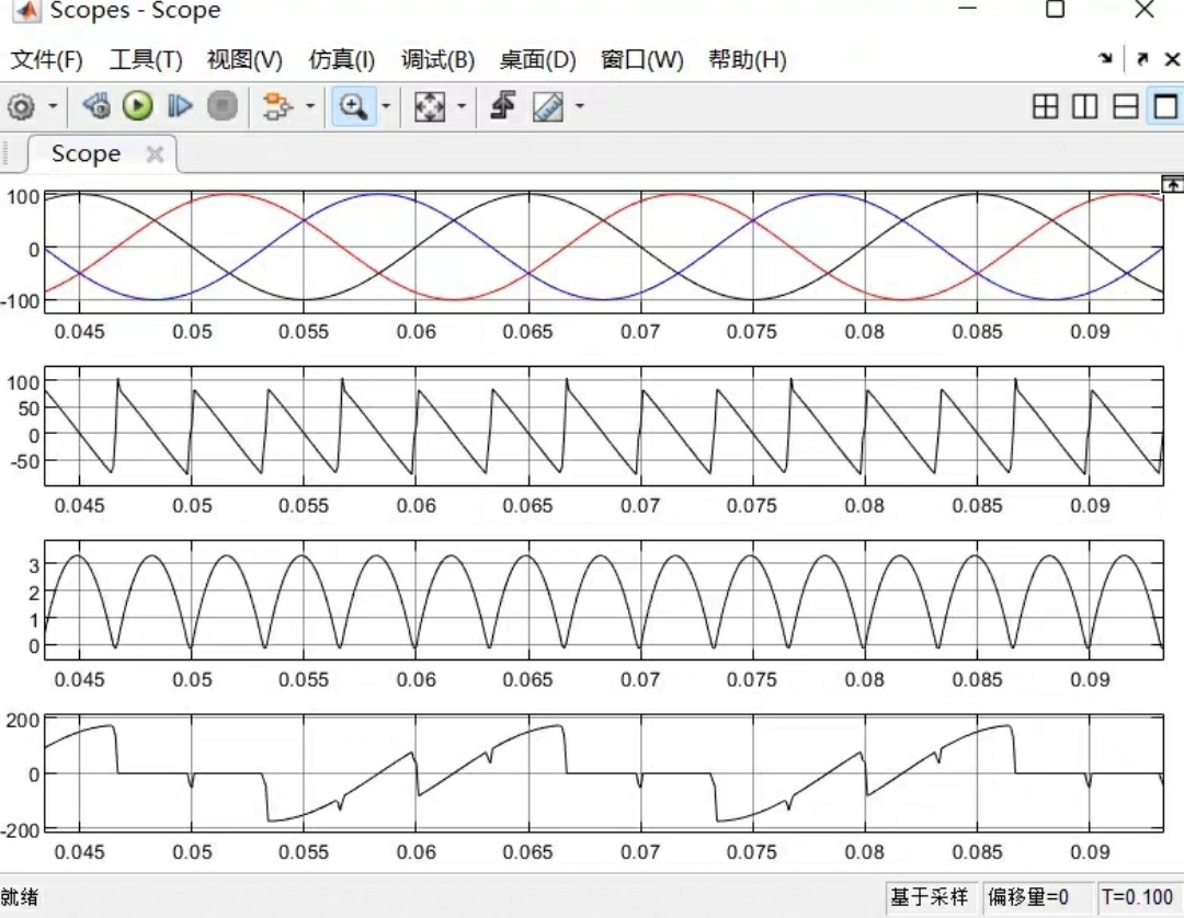 最后安利个调试技巧:在Simulink里把示波器的通道颜色改成红绿蓝三原色对应ABC三相,波形一出问题立马能定位到具体哪一相在搞事情。特别是当某相电流突然消失时(图4),八成是那个相的触发脉冲相位跑偏了——这时候请直接检查对应的Pulse Generator模块有没有被手贱改过参数。