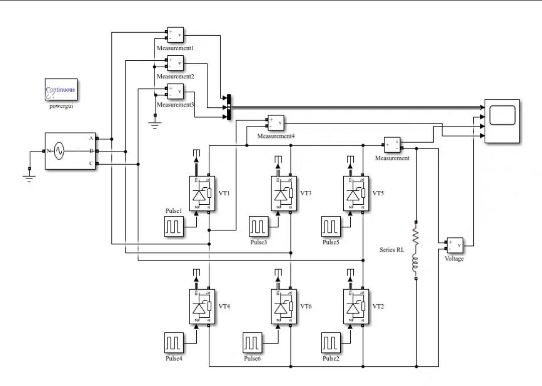重点来看晶闸管的触发逻辑(图2)。我们用了6个Pulse Generator分别控制六个开关管,这里最容易翻车的是触发脉冲的相位配合。看这段触发角设置代码: