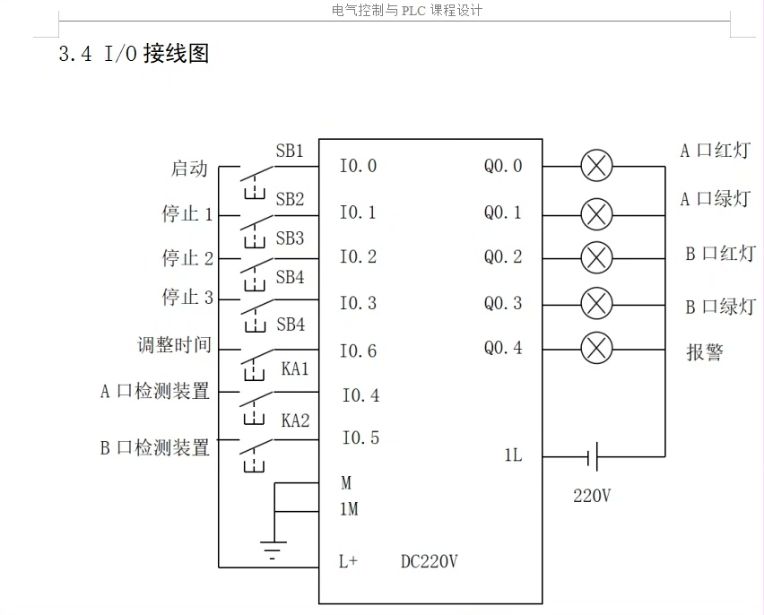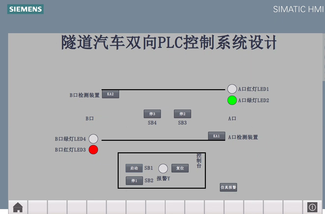 《基于S7-1200PLC的狭窄隧道汽车双向行控制系统设计》 一、设计任务书 1)无人值班指挥,能错开时序双向行车。 2)按启动按钮,A口绿灯亮,B口红灯亮,信号灯控制系统开始工作。 3)两道口绿灯不能同时亮,如果万一同时亮,系统停止工作并报警。 4)从A口绿灯开始亮时计算,在持续5s内如果无车辆进入A口,则A口绿灯闪烁2后熄灭且红灯亮,而B口红灯熄灭绿灯亮。 同样,如果B口绿灯持续亮5s内无车辆进入B口,则B口绿灯闪烁2s熄灭红灯亮,而此时A口绿灯亮。 这是两道口均无车进入隧道的要求。 5)当A口绿灯亮时,从A口进入第一辆车算起,B口红灯持续亮90s,同时A口绿灯持续亮20s,接着闪烁2s后熄灭,红灯亮68s(B口红灯仍亮着)。 即待从A口进入隧道内的汽车全部开出后,B口才能进车。 6)当B口绿灯亮时,从B口进入第一辆车算起,A口红灯持续亮90s,B口绿灯持续亮20s,接着闪烁2s后熄灭,此后两道口红灯同时亮68s。 即等待从B口进入隧道内的汽车全部开出后,A口才能进车。 7)周而复始。 这是某大单位专用车道,车辆不会太多,一般从早上6时到夜里10时使用。 8)在两道口出入处,在隧道中从A口算起130和260处各安装一个停止信号灯控制系统工作的开关S,作为交通事故时的急停用。 两个道口安装有红外线自动检测装置,检测车辆进入隧道的情况,并通过小型继电器的触点KA1和KA2,把信号输入PLC。 二、商品包含 ①博途PLC与HMI仿真工程(博途V16或以上) 一份; ②配套IO点表+PLC接线图+主电路图+控制流程图 ; ③博途仿真工程配套视频讲解一份; ④原版设计任务书一份。
