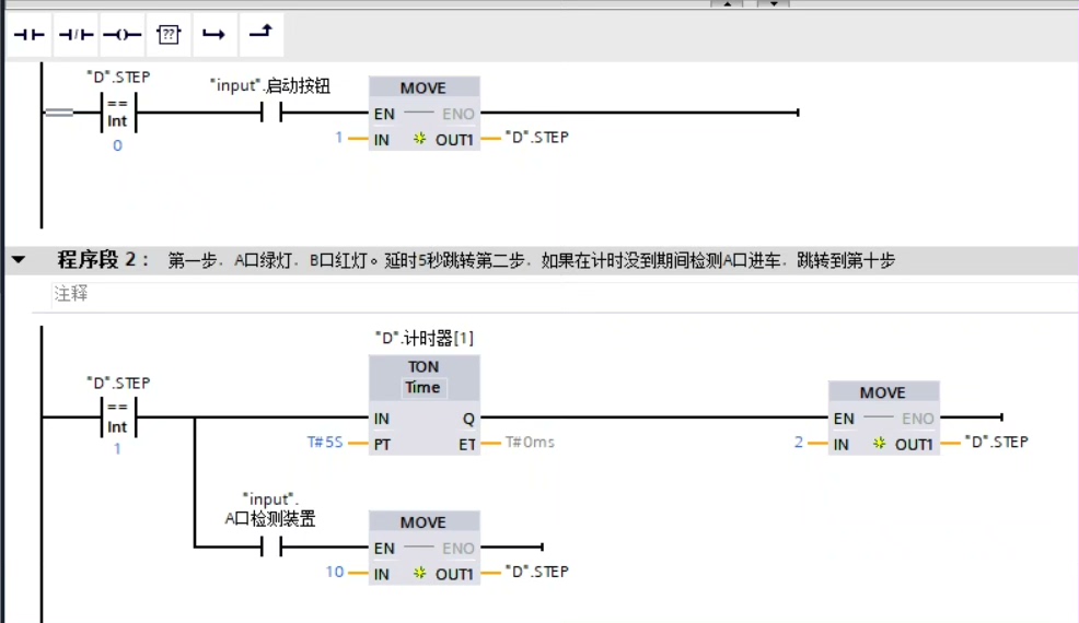 车辆检测的"智能等待"是另一个亮点。当A口绿灯亮起后,我们用TOF型定时器实现5秒等待: