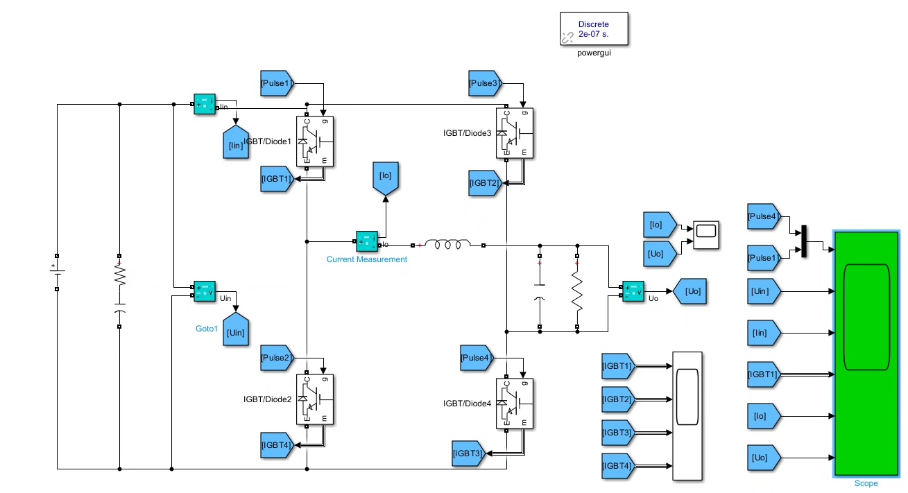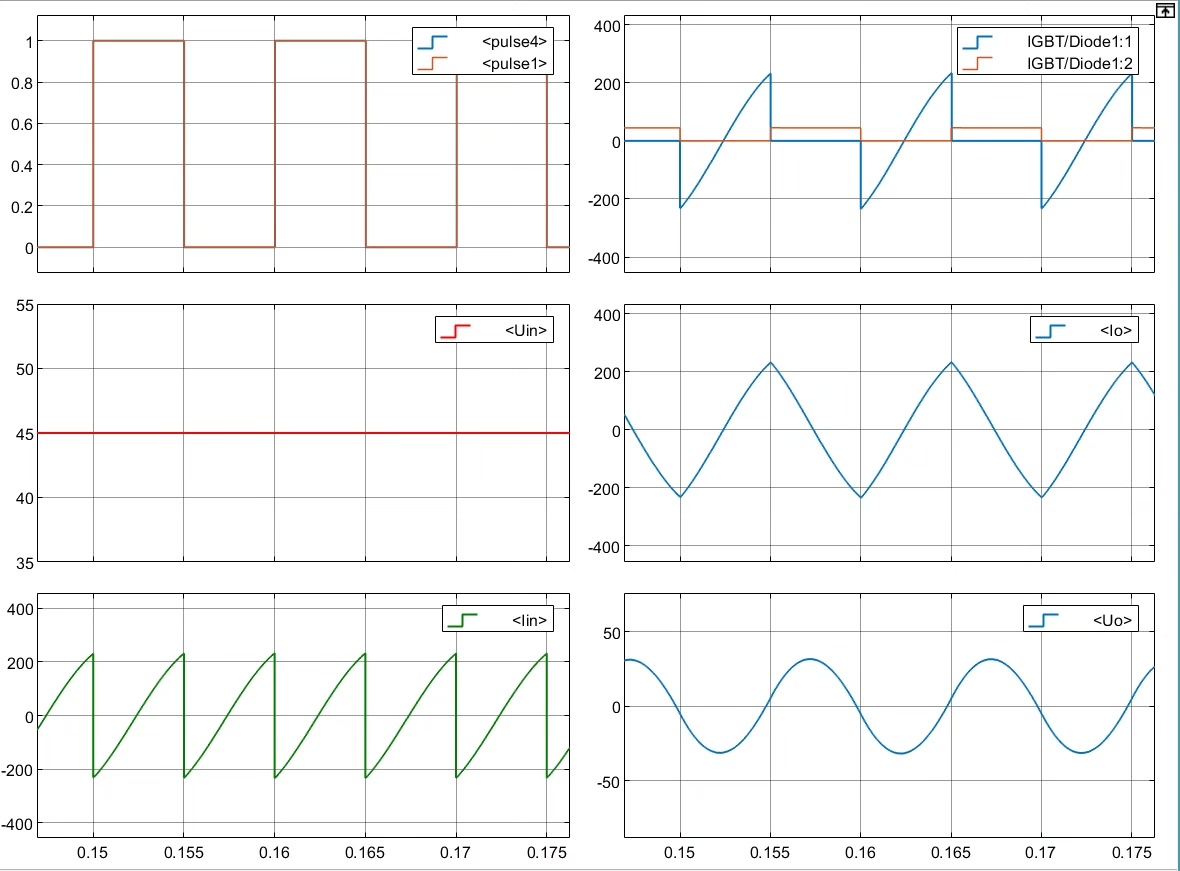驱动脉冲的死区时间设置是个隐藏关卡。用Pulse Generator模块时,周期设20ms(对应50Hz),但相位差必须严格错开。上机实测发现死区时间低于2us就会炸管,设3us时波形最干净。有个细节:四个开关管的触发脉冲要用[1 0 0 1]和[0 1 1 0]这种组合,避免直通。