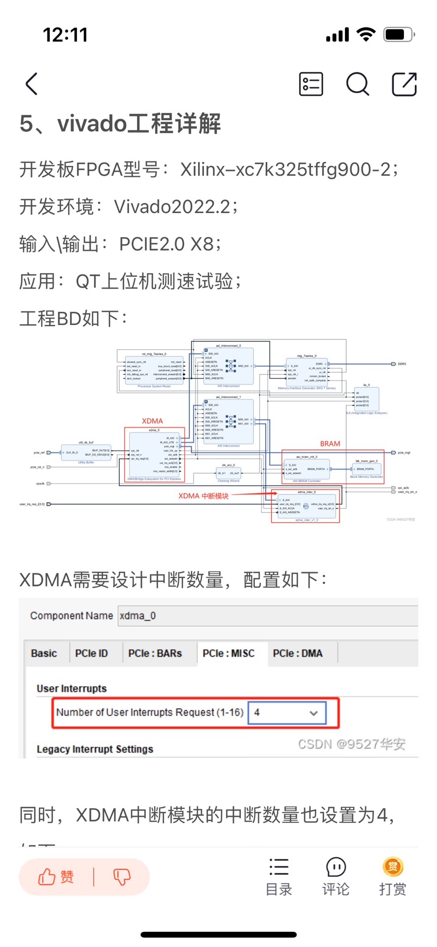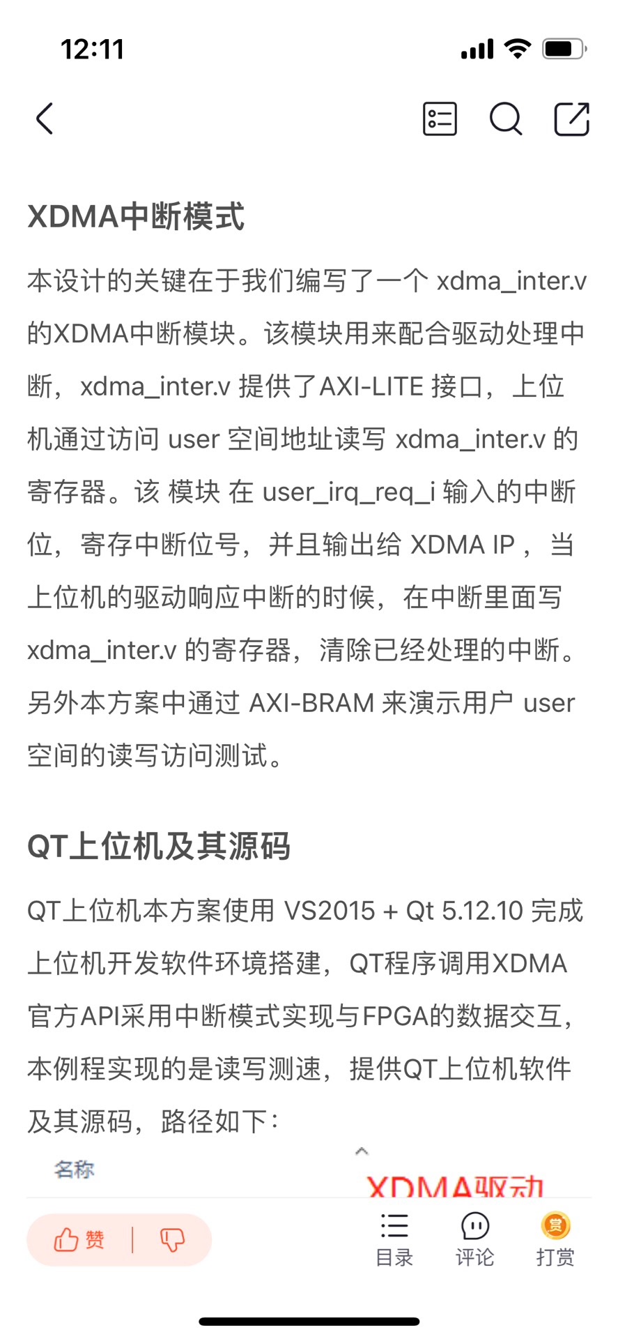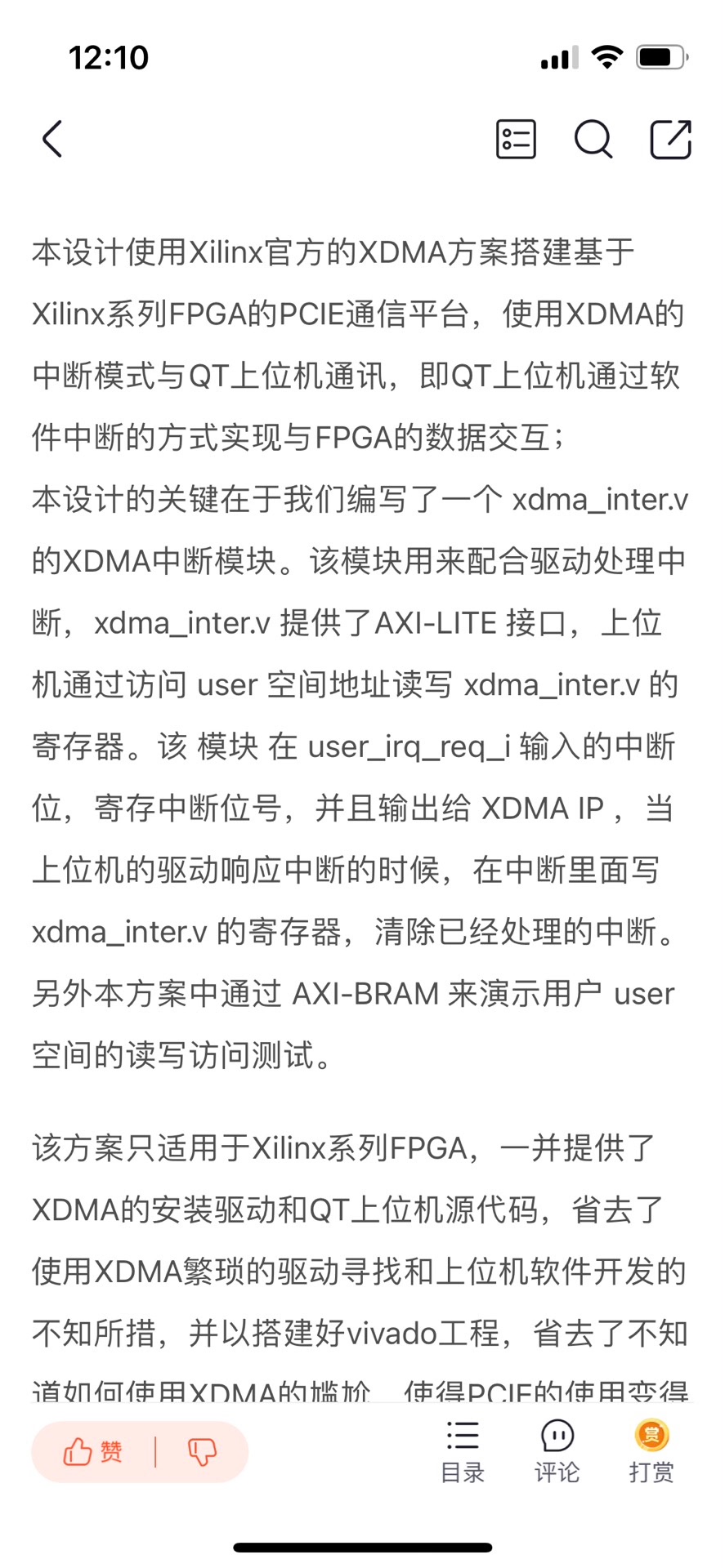FPGA XDMA 中断模式的PCIE测速例程 开发板FPGA型号为Xilinx–>Kintex UltraScale–xcku060-ffva1156-2-i;FPGA内部设置了一个定时器,间隔8ms产生一次上升沿作为XDMA用户逻辑中断输出给XDMA;XDMA配置了两路数据缓存通道,一条是AXI4-FULL接口的DDR数据缓存通道,以板载的DDR4作为缓存介质,用于大批量数据传输,另一条是AXI4-Lite接口的BRAM数据缓存通道,以FPGA内部BRAM作为缓存介质,用于少量用户数据传输;同时提供一套基于X86架构的PC端的QT上位机实现PCIE测速试验,QT上位机调用XDMA驱动的API实现写速率计算,并将速率结果用码表方式呈现;提供Windows和Linux系统驱动和对应的测试软件;板子PCIE支持PCIE3.0,为8 Lane,XDMA配置为单Lane线速率8GT/s;用于快速搭建并验证基于FPGA_XDMA中断模式的PCIE数据通信架构; 开发板FPGA型号:Xilinx–Kintex UltraScale–xcku060-ffva1156-2-i; FPGA开发环境:Vivado2019.1; QT开发环境:VS2015 + Qt 5.12.10; PCIE详情:PCIE3.0版本,X8,8GT/s单lane线速率; PCIE底层方案:XDMA,中断模式,配置4条用户中断; 数据缓存架构:DDR4+BRAM; 实现功能:FPGA实现PCIE3.0测速试验;? 工程作用:此工程目的是让读者掌握FPGA实现PCIE3.0测速试验的设计能力,以便能够移植和设计自己的项目; PCIE上板调试注意事项 1:必须先安装本博提供的XDMA驱动,详情请参考第4章节的《XDMA驱动及其安装》,Windows版本驱动只需安装一次; 2:Windows版本下载FPGA工程bit后需要重启电脑,电脑才能识别到XDMA驱动;程序固化后也需要重启电脑;Linux版本每次载FPGA工程bit后都需要重启电脑,都需要安装XDMA驱动; 3:FPGA板卡插在主机上后一般不需要额外供电,如果你的板子元器件较多功耗较大,则需要额外供电,详情咨询开发板厂家,当然,找我买板子的客户可以直接问我; 4:PCIE调试需要电脑主机,但笔记本电脑理论上也可以外接出来PCIE,详情百度自行搜索一下,电脑主机PCIE插槽不方便操作时可以使用延长线接出来,某宝有卖; FPGA实现PCIE数据传输现状; 目前基于Xilinx系列FPGA的PCIE通信架构主要有以下2种,一种是简单的、傻瓜式的、易于开发的、对新手友好的XDMA架构,该架构对PCIE协议底层做了封装,并加上了DMA引擎,使得使用的难度大大降低,加之Xilinx提供了配套的Windows和Linux系统驱动和上位机参考源代码,使得XDMA一经推出就让工程师们欲罢不能;另一种是更为底层的、需要设计者有一定PCIE协议知识的、更易于定制化开发的7 Series Integrated Block for PCI Express架构,该IP实现的是PCIe 的物理层、链路层和事务层,提供给用户的是以 AXI4-stream 接口定义的TLP 包,使用该IP 核,需要对PCIe 协议有清楚的理解,特别是对事务包TLP报文格式;本设计采用第一种方案,使用XDMA的中断模式实现PCIE通信;本架构既有简单的测速实验,也有视频采集应用; 工程概述 本设计使用Xilinx系列FPGA为平台,调用Xilinx官方的XDMA方案搭建基中断模式下的PCIE3.0通信架构;需要注意的是,并不是所有FPGA都支持PCIE3.0,以Xilinx为例,只有Virtex7及其以上或者UltraScale系列高端FPGA才支持;低端FPGA只能支持到PCIE2.0,关于PCIE2.0的设计方案,可以参考我博客主页,有丰富案例;XDMA的数据缓存有两条通路,一条基于DDR3的大批量数据缓存通路,该条通路一般用作图像、AD数据等缓存,适用于使用板载DDR作为缓存的大量批量数据传输方案;另一条基于BRAM的小批量用户数据缓存通路,该条通路一般用作用户控制数据的缓存,适用于使用FPGA内部BRAM作为缓存的大量批量数据传输方案;XDMA配置为中断模式,配合手写的XDMA中断模块使用,该中断模块主要负责与用户逻辑交互,指示用户逻辑可以发起中断,并将用户逻辑发起的中断转发给XDMA;用户逻辑侧设置了一个定时器,大约间隔8ms发起一次XDMA中断;同时提供一套基于X86架构的PC端的QT上位机实现PCIE测速试验,QT上位机调用XDMA驱动的API实现写速率计算,并将速率结果用码表方式呈现 工程移植说明 vivado版本不一致处理 1:如果你的vivado版本与本工程vivado版本一致,则直接打开工程; 2:如果你的vivado版本低于本工程vivado版本,则需要打开工程后,点击文件–>另存为;但此方法并不保险,最保险的方法是将你的vivado版本升级到本工程vivado的版本或者更高版本;