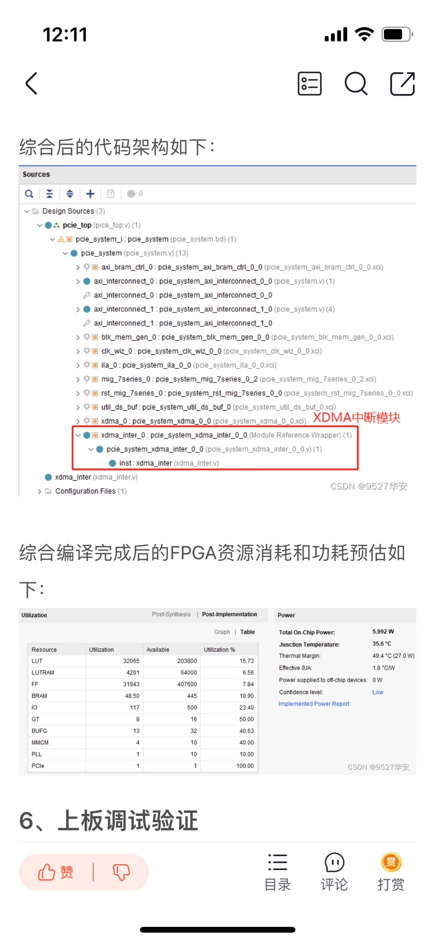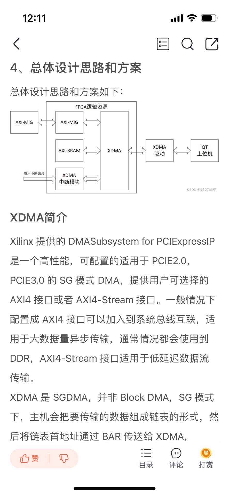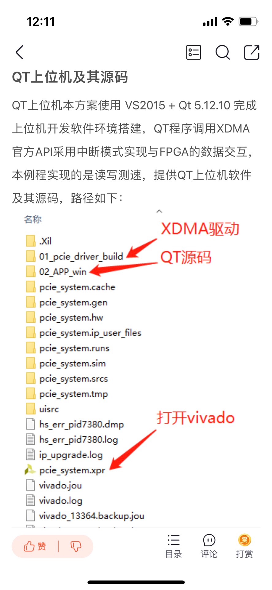 FPGA XDMA 中断模式的PCIE测速例程 开发板FPGA型号为Xilinx–>Kintex UltraScale–xcku060-ffva1156-2-i;FPGA内部设置了一个定时器,间隔8ms产生一次上升沿作为XDMA用户逻辑中断输出给XDMA;XDMA配置了两路数据缓存通道,一条是AXI4-FULL接口的DDR数据缓存通道,以板载的DDR4作为缓存介质,用于大批量数据传输,另一条是AXI4-Lite接口的BRAM数据缓存通道,以FPGA内部BRAM作为缓存介质,用于少量用户数据传输;同时提供一套基于X86架构的PC端的QT上位机实现PCIE测速试验,QT上位机调用XDMA驱动的API实现写速率计算,并将速率结果用码表方式呈现;提供Windows和Linux系统驱动和对应的测试软件;板子PCIE支持PCIE3.0,为8 Lane,XDMA配置为单Lane线速率8GT/s;用于快速搭建并验证基于FPGA_XDMA中断模式的PCIE数据通信架构; 开发板FPGA型号:Xilinx–Kintex UltraScale–xcku060-ffva1156-2-i; FPGA开发环境:Vivado2019.1; QT开发环境:VS2015 + Qt 5.12.10; PCIE详情:PCIE3.0版本,X8,8GT/s单lane线速率; PCIE底层方案:XDMA,中断模式,配置4条用户中断; 数据缓存架构:DDR4+BRAM; 实现功能:FPGA实现PCIE3.0测速试验;? 工程作用:此工程目的是让读者掌握FPGA实现PCIE3.0测速试验的设计能力,以便能够移植和设计自己的项目; PCIE上板调试注意事项 1:必须先安装本博提供的XDMA驱动,详情请参考第4章节的《XDMA驱动及其安装》,Windows版本驱动只需安装一次; 2:Windows版本下载FPGA工程bit后需要重启电脑,电脑才能识别到XDMA驱动;程序固化后也需要重启电脑;Linux版本每次载FPGA工程bit后都需要重启电脑,都需要安装XDMA驱动; 3:FPGA板卡插在主机上后一般不需要额外供电,如果你的板子元器件较多功耗较大,则需要额外供电,详情咨询开发板厂家,当然,找我买板子的客户可以直接问我; 4:PCIE调试需要电脑主机,但笔记本电脑理论上也可以外接出来PCIE,详情百度自行搜索一下,电脑主机PCIE插槽不方便操作时可以使用延长线接出来,某宝有卖; FPGA实现PCIE数据传输现状; 目前基于Xilinx系列FPGA的PCIE通信架构主要有以下2种,一种是简单的、傻瓜式的、易于开发的、对新手友好的XDMA架构,该架构对PCIE协议底层做了封装,并加上了DMA引擎,使得使用的难度大大降低,加之Xilinx提供了配套的Windows和Linux系统驱动和上位机参考源代码,使得XDMA一经推出就让工程师们欲罢不能;另一种是更为底层的、需要设计者有一定PCIE协议知识的、更易于定制化开发的7 Series Integrated Block for PCI Express架构,该IP实现的是PCIe 的物理层、链路层和事务层,提供给用户的是以 AXI4-stream 接口定义的TLP 包,使用该IP 核,需要对PCIe 协议有清楚的理解,特别是对事务包TLP报文格式;本设计采用第一种方案,使用XDMA的中断模式实现PCIE通信;本架构既有简单的测速实验,也有视频采集应用; 工程概述 本设计使用Xilinx系列FPGA为平台,调用Xilinx官方的XDMA方案搭建基中断模式下的PCIE3.0通信架构;需要注意的是,并不是所有FPGA都支持PCIE3.0,以Xilinx为例,只有Virtex7及其以上或者UltraScale系列高端FPGA才支持;低端FPGA只能支持到PCIE2.0,关于PCIE2.0的设计方案,可以参考我博客主页,有丰富案例;XDMA的数据缓存有两条通路,一条基于DDR3的大批量数据缓存通路,该条通路一般用作图像、AD数据等缓存,适用于使用板载DDR作为缓存的大量批量数据传输方案;另一条基于BRAM的小批量用户数据缓存通路,该条通路一般用作用户控制数据的缓存,适用于使用FPGA内部BRAM作为缓存的大量批量数据传输方案;XDMA配置为中断模式,配合手写的XDMA中断模块使用,该中断模块主要负责与用户逻辑交互,指示用户逻辑可以发起中断,并将用户逻辑发起的中断转发给XDMA;用户逻辑侧设置了一个定时器,大约间隔8ms发起一次XDMA中断;同时提供一套基于X86架构的PC端的QT上位机实现PCIE测速试验,QT上位机调用XDMA驱动的API实现写速率计算,并将速率结果用码表方式呈现 工程移植说明 vivado版本不一致处理 1:如果你的vivado版本与本工程vivado版本一致,则直接打开工程; 2:如果你的vivado版本低于本工程vivado版本,则需要打开工程后,点击文件–>另存为;但此方法并不保险,最保险的方法是将你的vivado版本升级到本工程vivado的版本或者更高版本;