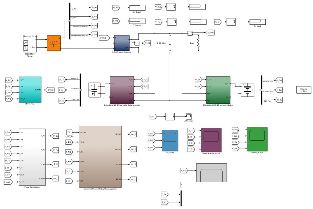 蓄电池超级电容混合储能系统simulink能量管理仿真模型 光伏发电+电池储能仿真 simulink仿真,MPPT(增量导纳法),双向buck/boost 电路 【含笔记+建模参考】 包含相关参考文献及原理介绍文档 采用扰动观察法实现光能最大功率点跟踪 运行性能好 满足并网运行条件,具备很好的学习性和参考价值
