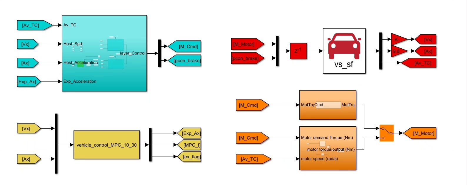 电动汽车纵向速度MPC控制器。 采用上层控制器和下层控制器。 目标为控制车辆的纵向速度,使其跟踪上期望纵向速度曲线。 ●上层控制器:控制方式为MPC控制器,输入为车辆纵向速度和纵向加速度,输出为期望加速度,并且对加速度增加进行约束。 ●下层控制器:车辆的制动根据逆向纵向动力学模型搭建、车辆的驱动根据电机MAP图搭建。 包含驱动制动切换逻辑、PID控制器等模块。 ●可实现正弦速度曲线的速度加速度的准确跟踪,以及五次多项式速度曲线的速度和加速度跟踪。