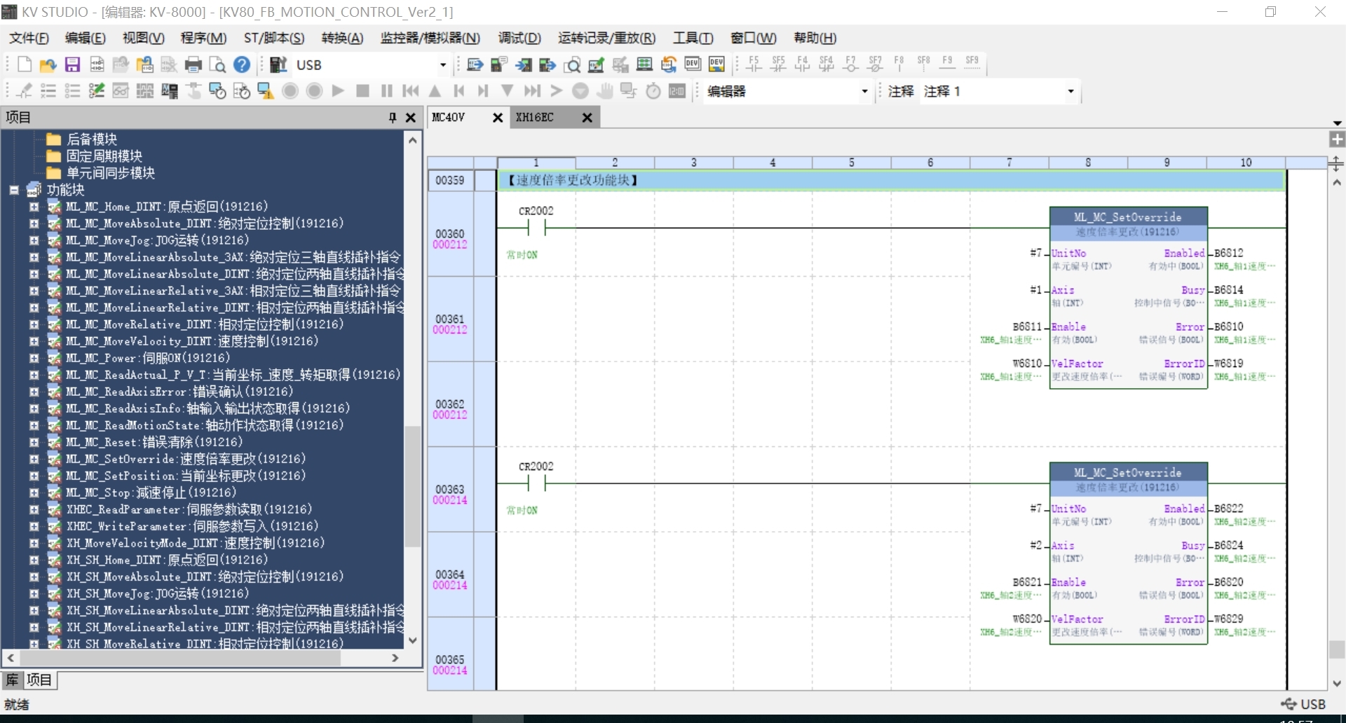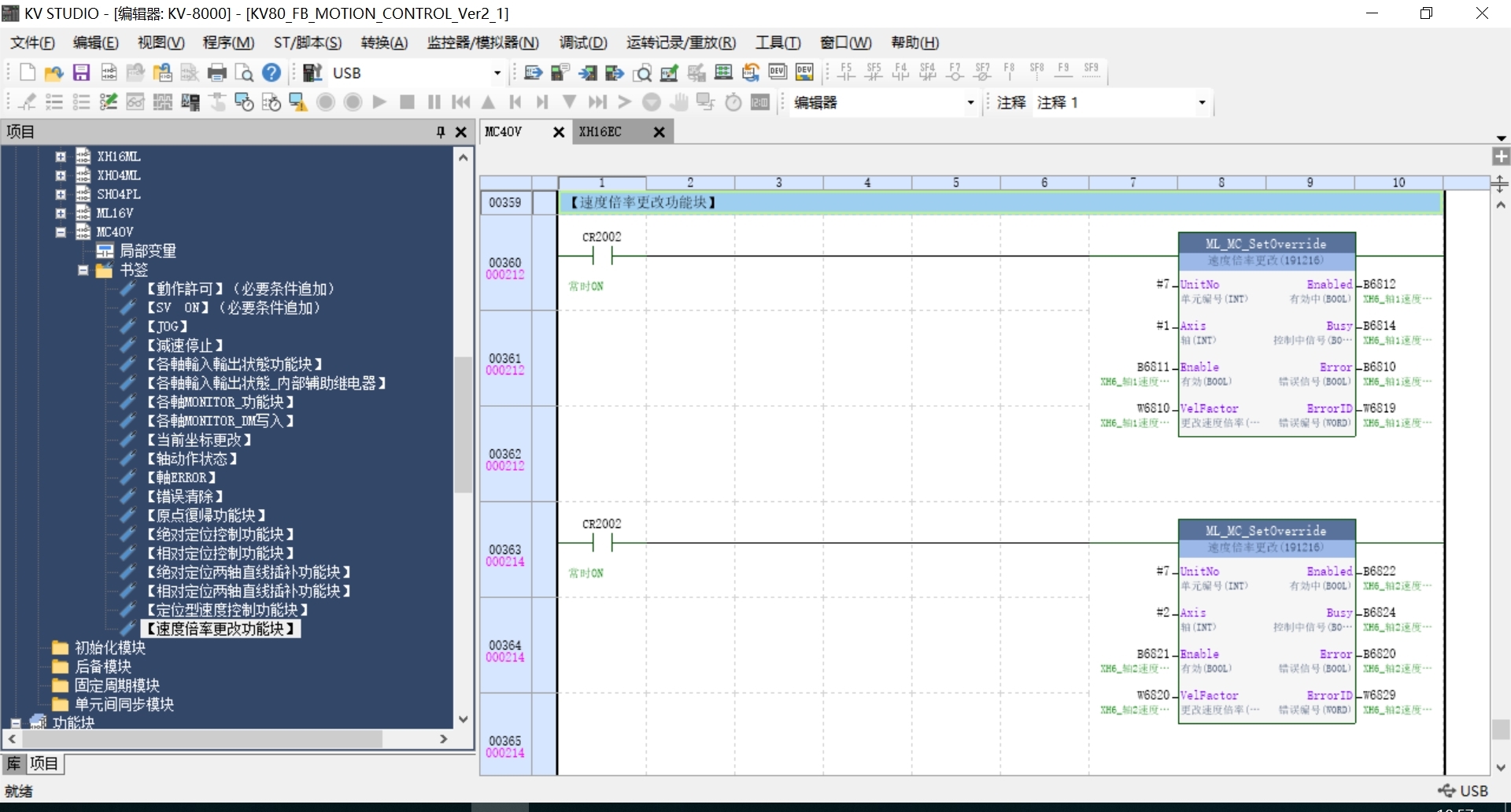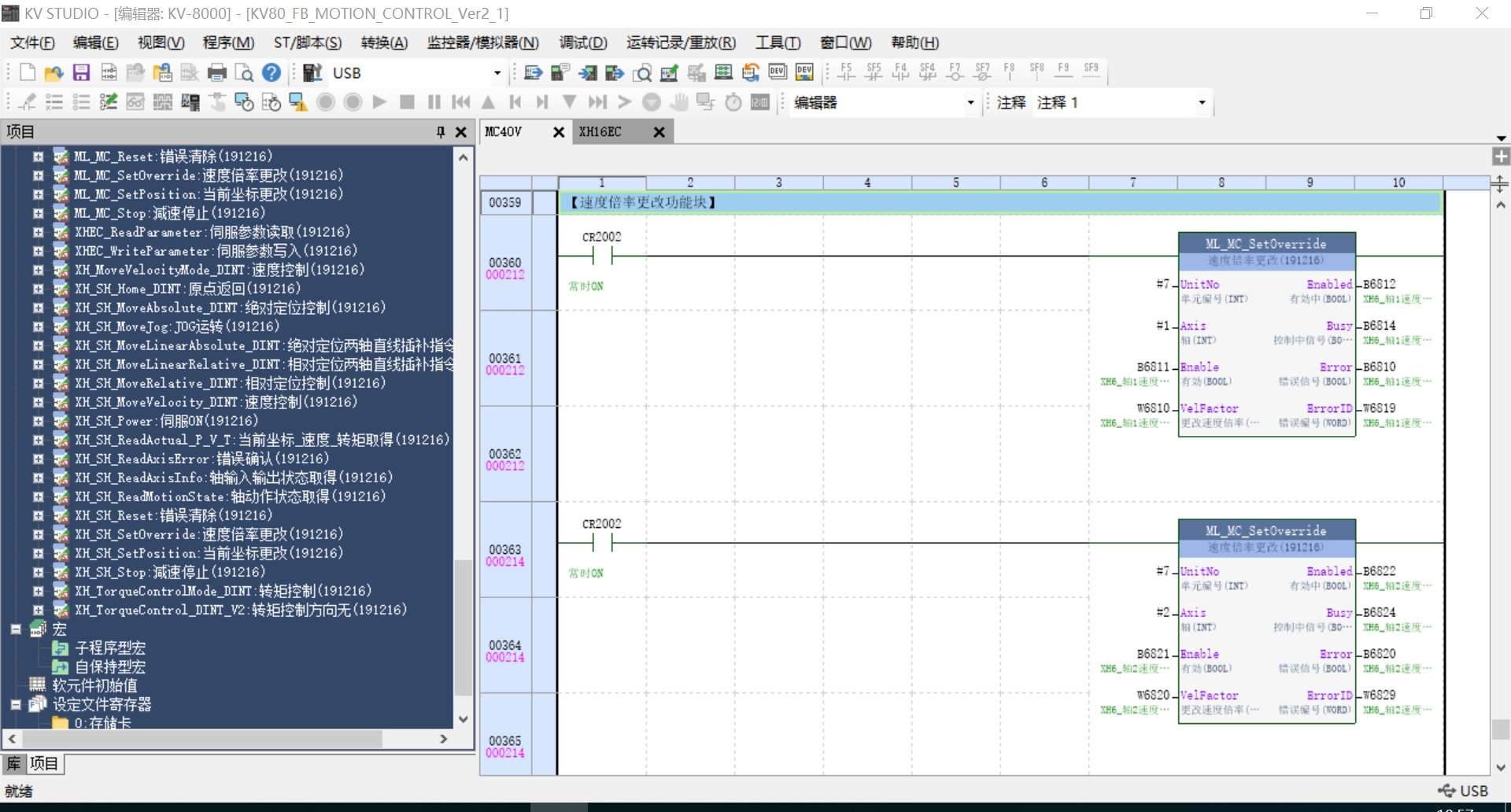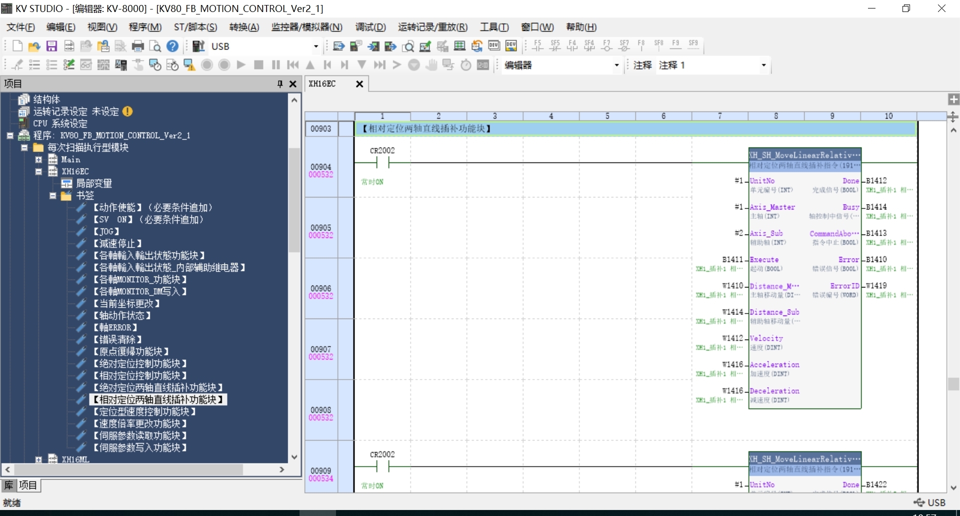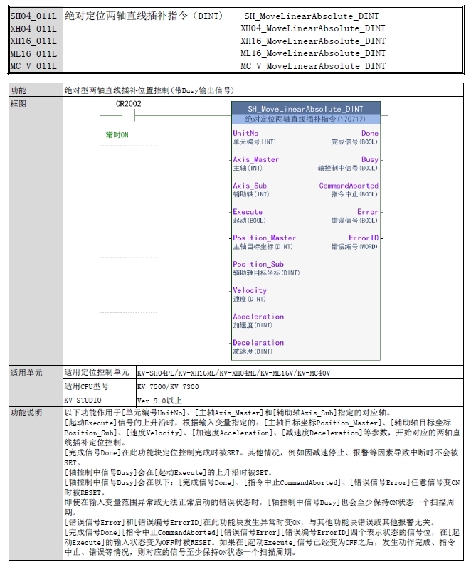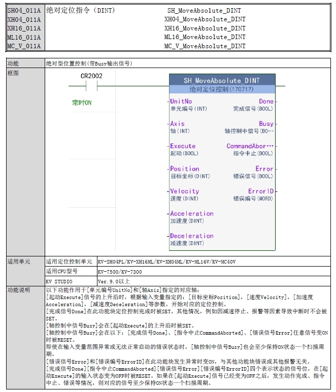 基恩士KV7500,KV8000轴控制FB模板,直接可以拿来用,使基恩士编程也随心所欲。 包含了适配5种定位控制单元的FB,像常用的KV-XH16ML、KV-SH04PL等都有适配的FB。 功能上包含了原点返回、绝对定位、相对定位、速度控制、力矩控制、两轴直线插补等。 可以说常用的基本都有了,非常方便使用。 重要的是附带详细的说明文档,每个FB的功能说明,时序图、引脚定义都说明的十分清楚。 PLC