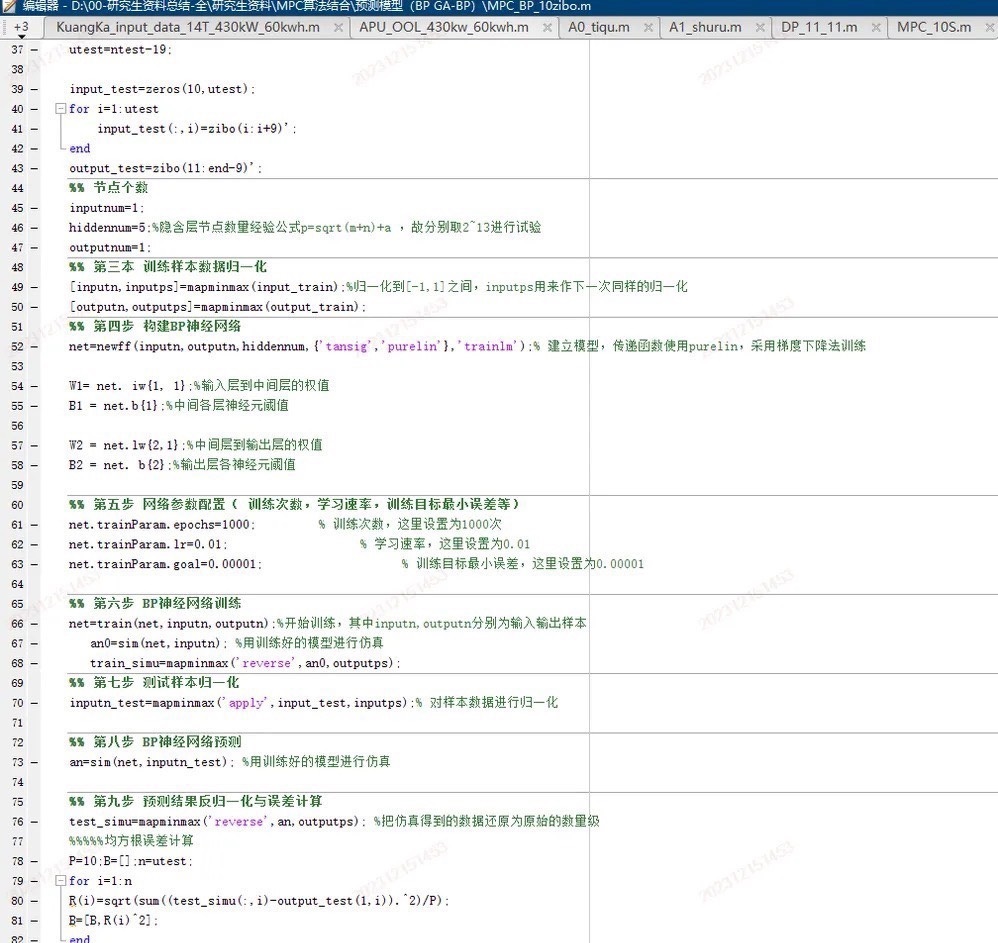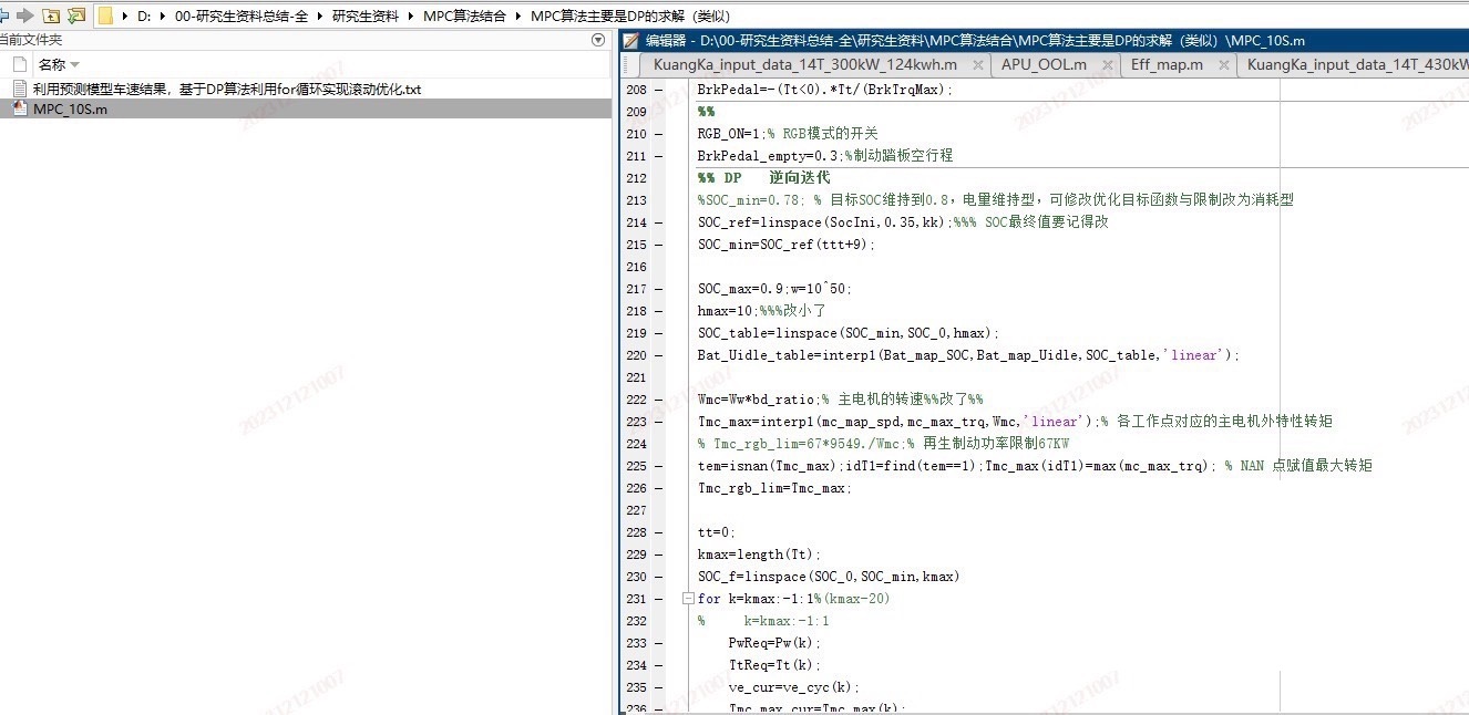 模型预测控制(MPC)在混合动力汽车能量管理策略开发上的运用。 [1]利用车速预测模型(BP或者RBF神经网络,预测模型资料也有发在其他链接)根据预测的信息对车辆进行优化控制,可以对混动汽车的能量管理具有一定的参考意义。 [2]动态规划算法作为全局优化的代表,恰好作为模型预测控制的算法求解器,再与车速预测模型结合实现基于模型预测(MPC)的能量管理策略的预测时预内的局部最优近似全局最优的优化效果,实现混动车辆的燃油经济性最优! 和模型预测MPC结合运用,加上预测模型可实现在线预测近似实时最优!! 逆向迭代,正向求解(混动整车能量管理做到全局最优) 提供动态规划算法程序(DP) 神经网络预测模型程序(GA-BP/RBF)=模型预测控制