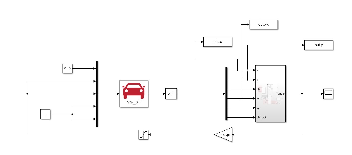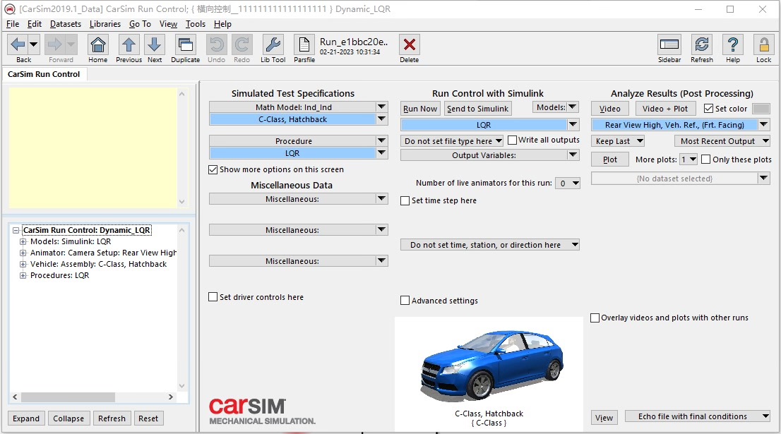 通过matlab/simulink和carsim联合仿真,能更真实地模拟车辆在实际行驶中的情况。在simulink中搭建基于动力学跟踪误差模型的LQR控制模块,将其输出的转向角度作为carsim的输入,同时从carsim获取车辆的实时状态反馈给simulink进行下一步的计算。具体的联合仿真设置这里就不赘述了,网上有很多相关教程。
