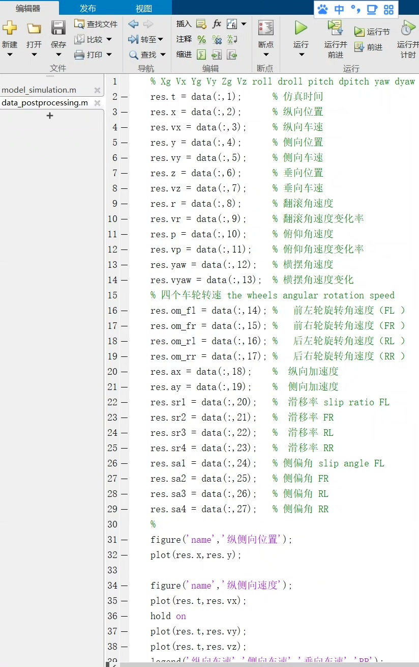基于C语言的车辆动力学建模,在visual studio中编写多自由度的建模程序,包含纵向,侧向,垂向运动,横摆运动,以及翻滚运动,四个车轮的转动。 除了输出这几个自由度的状态以外,还可输出纵向位置,侧向位置,四个车轮的滑移率,侧偏角等。 另外,在C语言模型的基础上,可将仿真得到的数据传递给python或者matlab,供其他画图,深度学习或者其他高级语言调用。