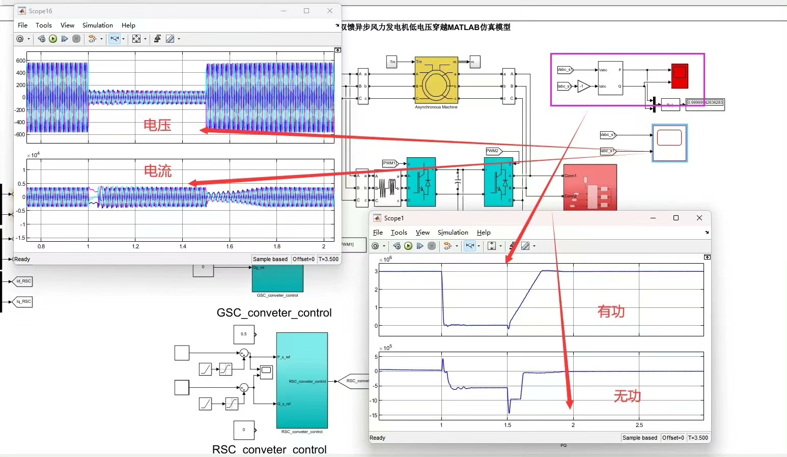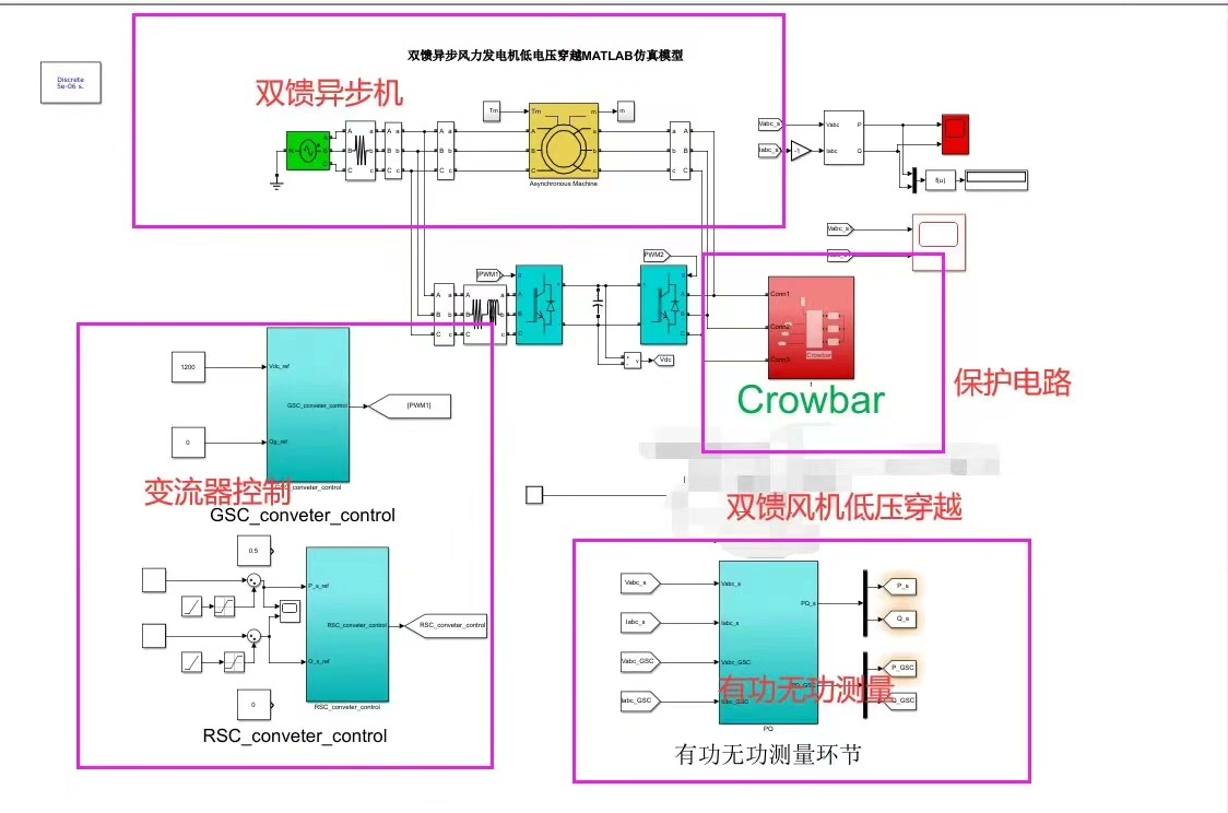 双馈风机 DFIG 低电压穿越 MATLAB仿真模型simulink, LVRT 双馈异步风力,Crowbar电路,波形如图 (1)转子侧变换器采用基于定子电压定向的矢量控制策略,有功无功解耦,具备MPPT能力,采用功率外环电流内环双闭环控制结构; (2)网侧采用电网电压定向的矢量控制策略,采用电压外环电流内环控制,直流母线电压稳定,输入功率因数为1。 波形如图