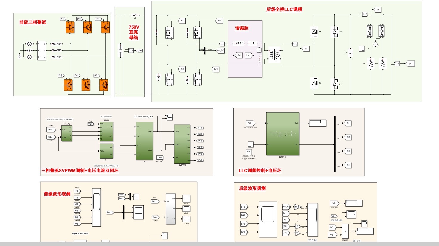 三相车载充电机充电桩PWM整流+全桥LLC Simlink仿真模型 前级三相PWM整流,单位功率因数运行,AC输入176~264V,中间级直流母线750V,一定范围内母线电压可调。 采用七段式SVPWM调制,低THD,电压电流双闭环控制。 后级全桥LLC,实现电压隔离和软开关,前级输入750V,LLC后级输出220V~450V,电压可调,额定功率 6.6kW,额定输入电压75QV,额定输出电压250V。 开关频率:26k~91k,准谐振点频率:50k左右。 提供仿真对应的LLC参数设计书(pdf和mathematica 文件),大量整理的LLC学习资料模态分析等等