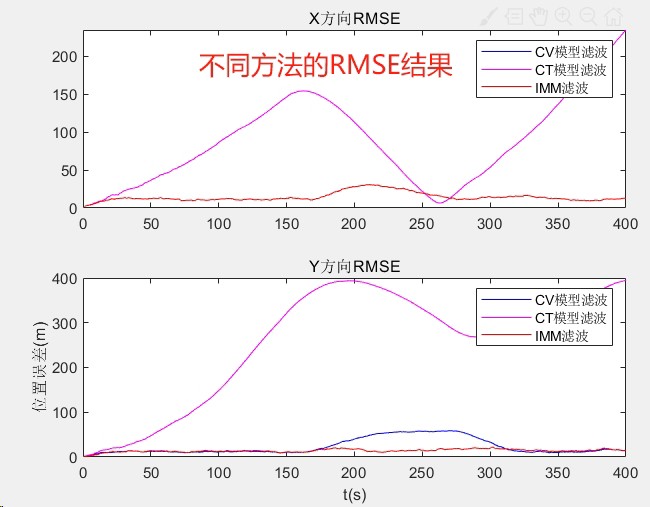 基于CV模型卡尔曼滤波、CT模型卡尔曼滤波、IMM模型滤波的目标跟踪。 输出跟踪轨迹及其误差。 程序已调通,可直接运行。