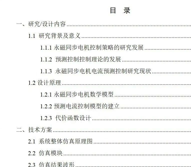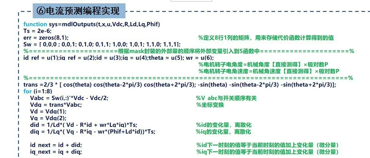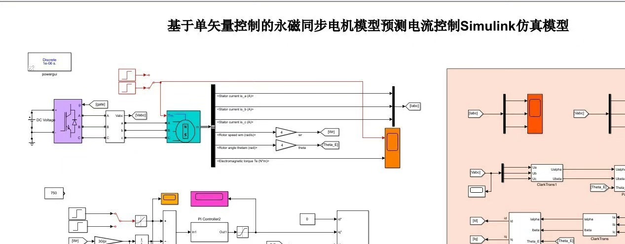 基于单矢量控制的永磁同步电机模型预测电流控制Simulink仿真模型 对应学习资料: 1.带一份与仿真对应的Word详细说明报告。 2.一份与仿真对应的详细讲解PPT 针对具体被控对象(PMSM),建立定子电流预测模型,然后通过采集当前时刻的定子电流值来计算得出对应的电流环输出,以预测模型替换了PI控制器后,省去设计控制器时困难的参数选取,避免了PI控制器惯有的超调等问题,并且预测控制比传统PI控制的动态响应更快,鲁棒性更强。 预测计算得到下一时刻的定子电流值于在线寻优过程中能够依据控制目标的要求进行优化,代价函数的构造可根据不同要求设计成不同形式,除了能够完成基本电流控制之外还具备实现多目标综合优化的能力,如考虑开关损耗等 看下图,有注释!!