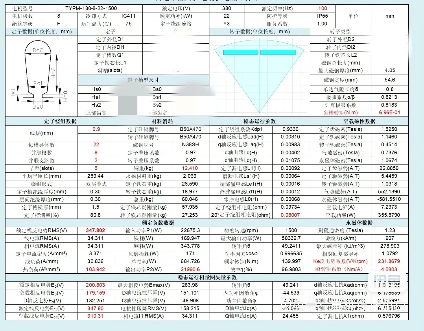 附件里那个2极到8极的电磁方案计算单才是宝藏,比如把极数改成4极时:
