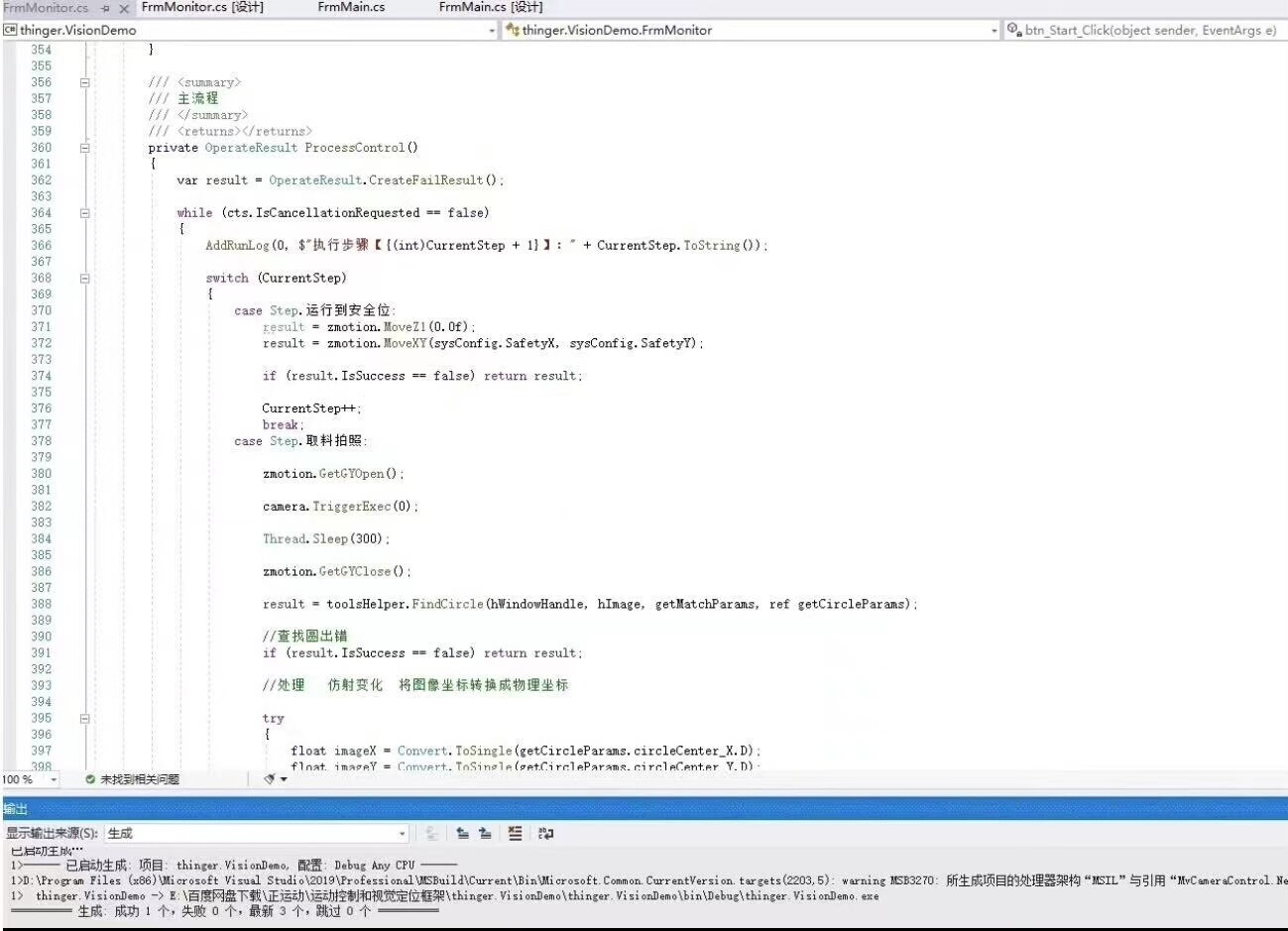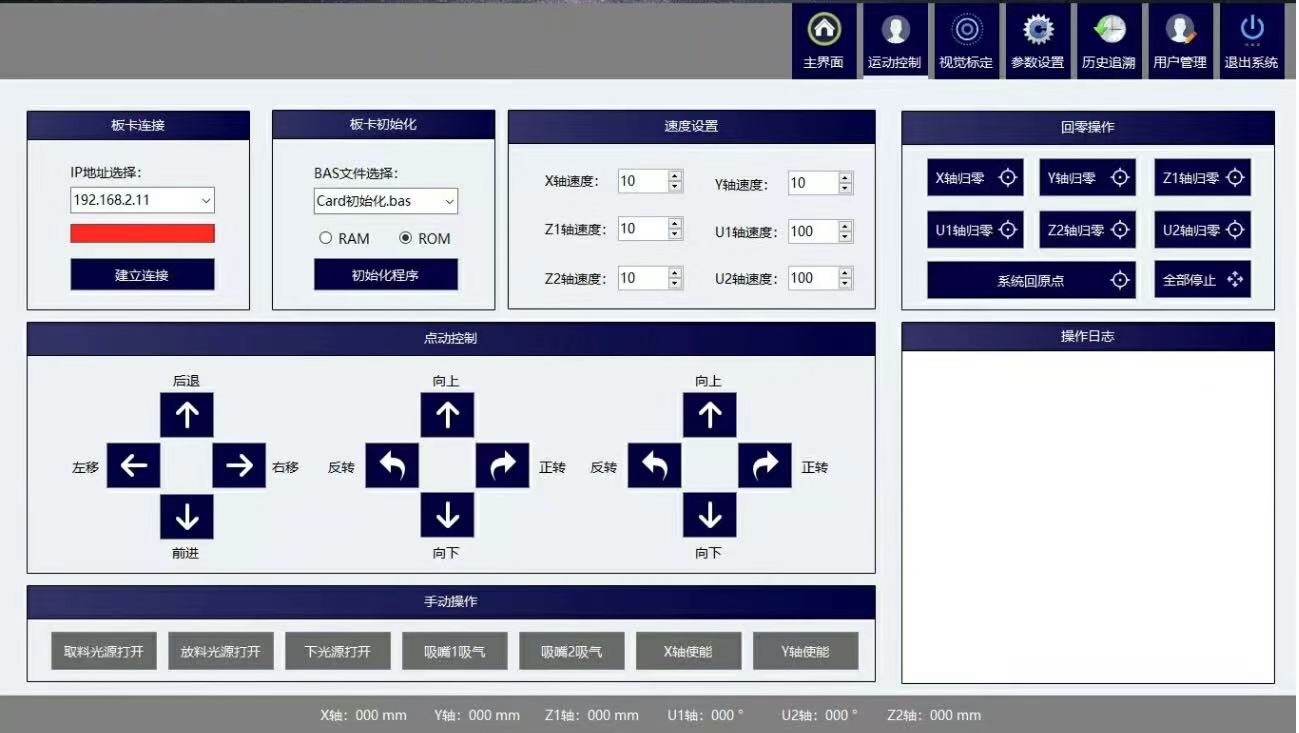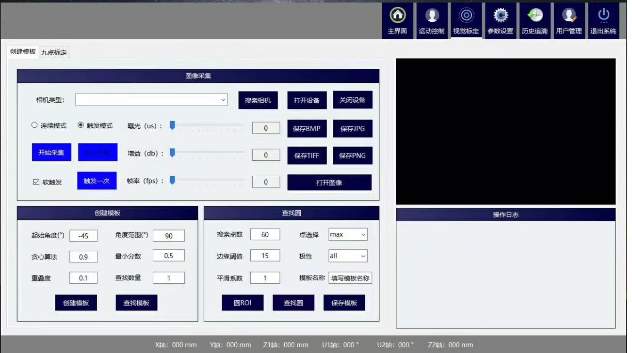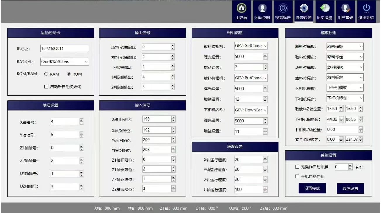 C#运动控制加视觉定位框架,程序用来取放料,控制卡用的是正运动ZMC408CE总线运动控制卡,控制六个电机,XY轴,两个Z轴,两个旋转轴,相机用的是海康,3个海康相机,视觉采取用海康SDK加Halcon动态库开发出来的,支持取料定位,纠偏和放料定位,视觉部分支持产品模板创建和保存,九点标定模板创建和保存,软件框架扩展性比较强,方便学者自己扩展 赠送详细讲解教程,带你手把手写代码,从编写思路给你讲起