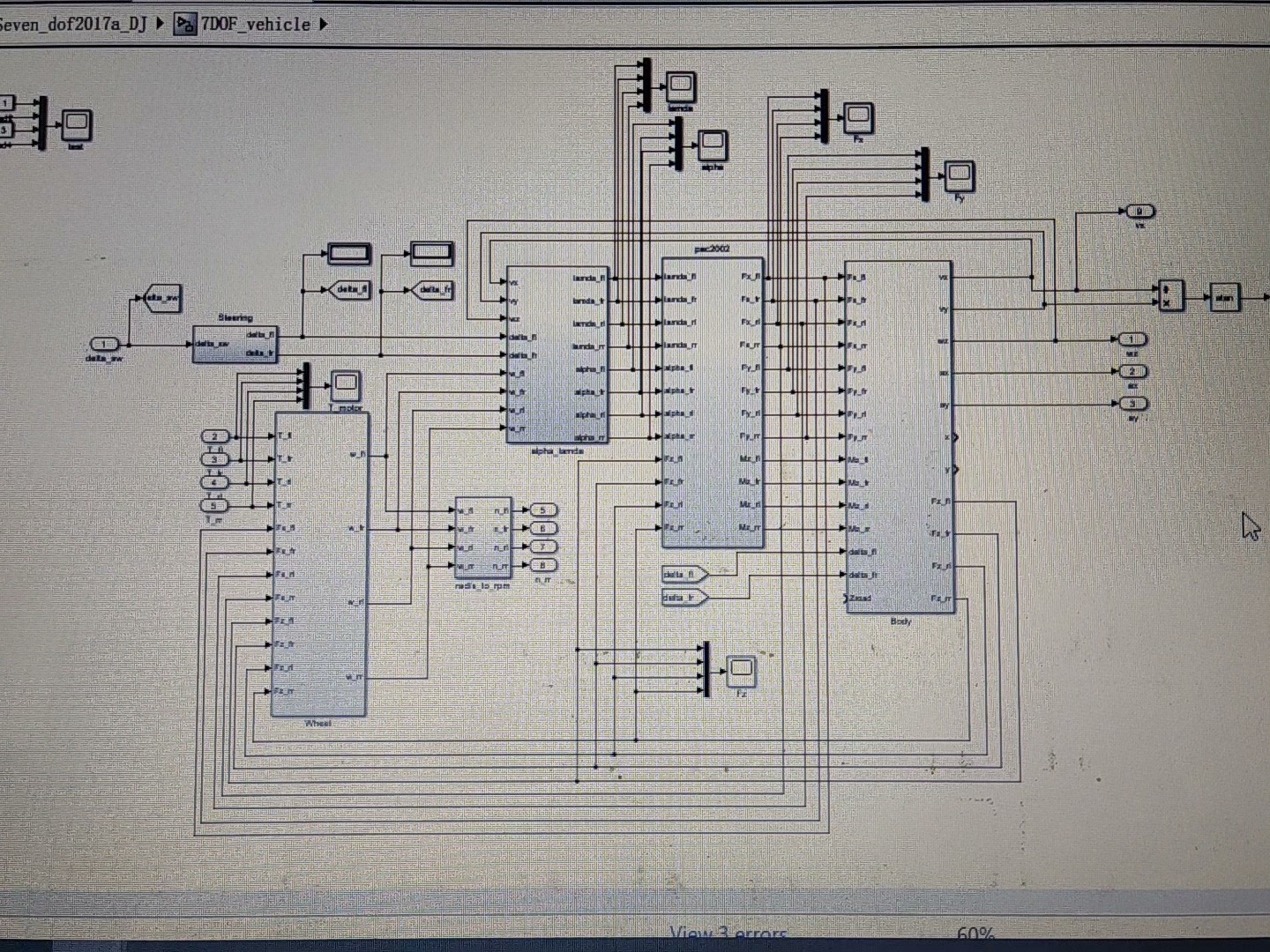 在这个简化代码中,我们可以看到如何基于车辆参数和轮胎力来计算纵向加速度 ax 和横摆角速度变化率 r_dot。实际在Simulink中,这些方程将通过相应的模块和信号连接来实现。