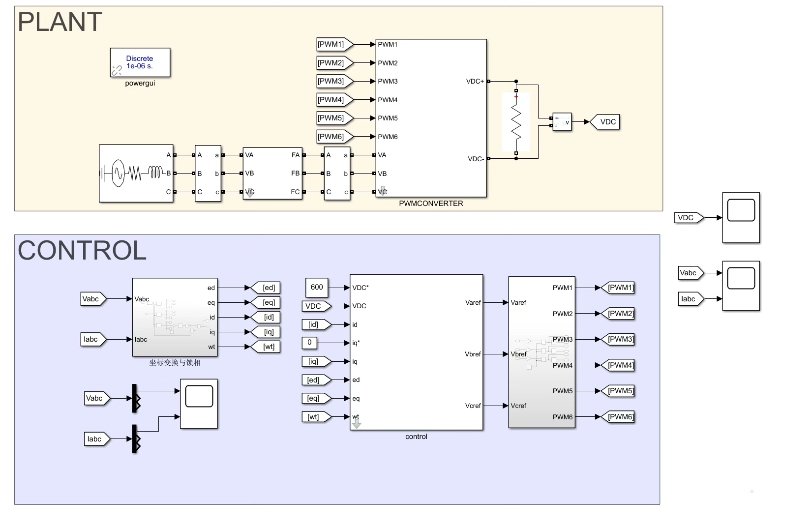 接下来添加VOC控制模块,这个模块会根据设定的输出电压目标,通过PI调节器来调整整流电路的输出。在Simulink模型里,PI调节器可以直接从模块库中拖入,连接好输入输出就行。