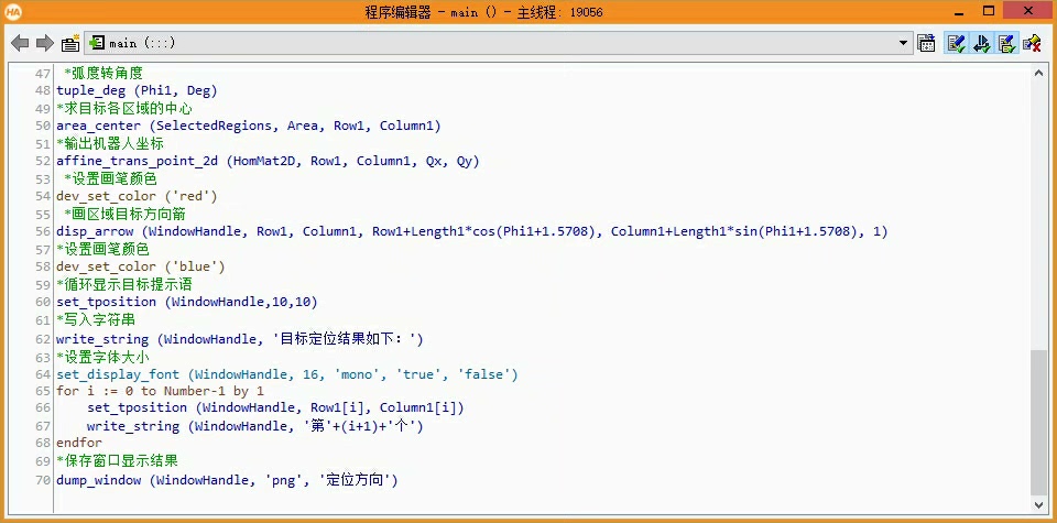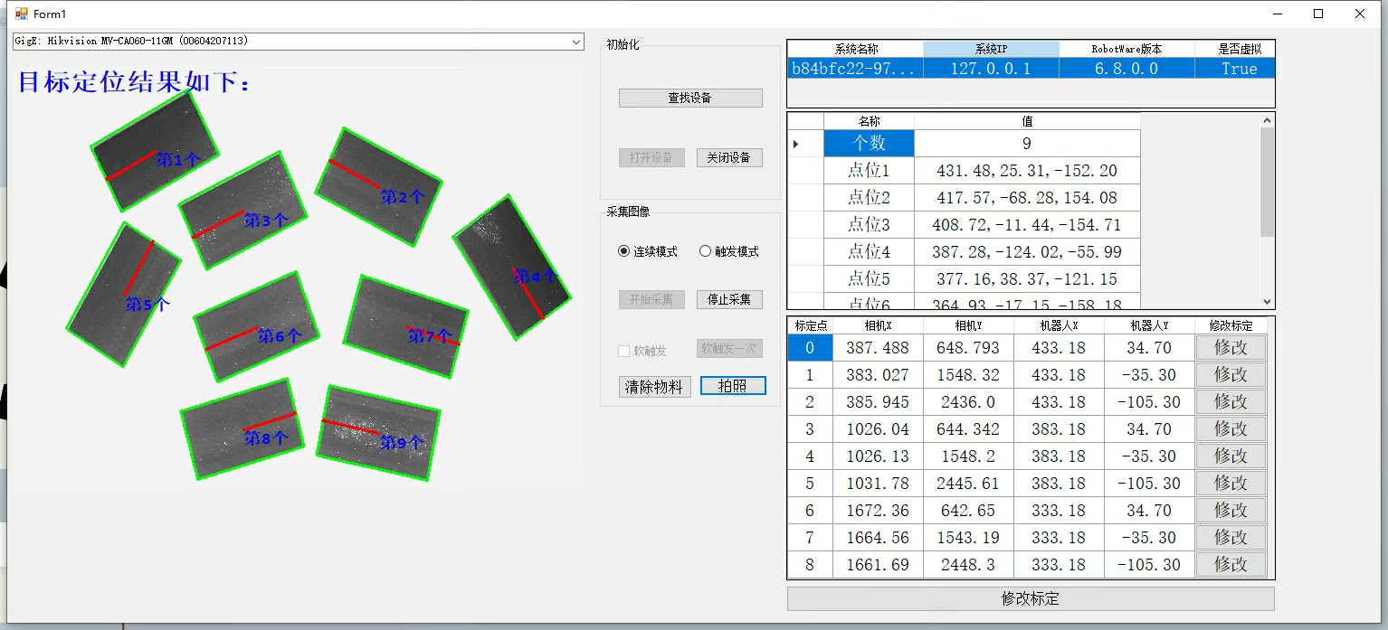 这里我们先假设获取到了九个点在图像中的行列坐标,分别存储在rowPoints和colPoints中。然后通过halcon.AffineTransPoint2d函数进行仿射变换相关计算,这个计算结果homMat2d在实际九点标定中用于建立图像坐标与实际世界坐标之间的转换关系,虽然这里只是简化示意,但大致思路就是这样,实际项目中还会涉及到更多的参数调整和误差优化。
