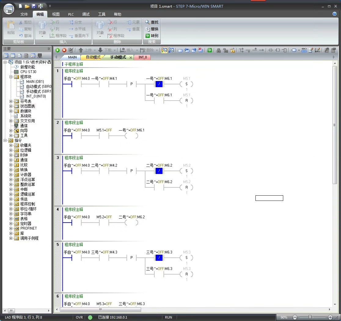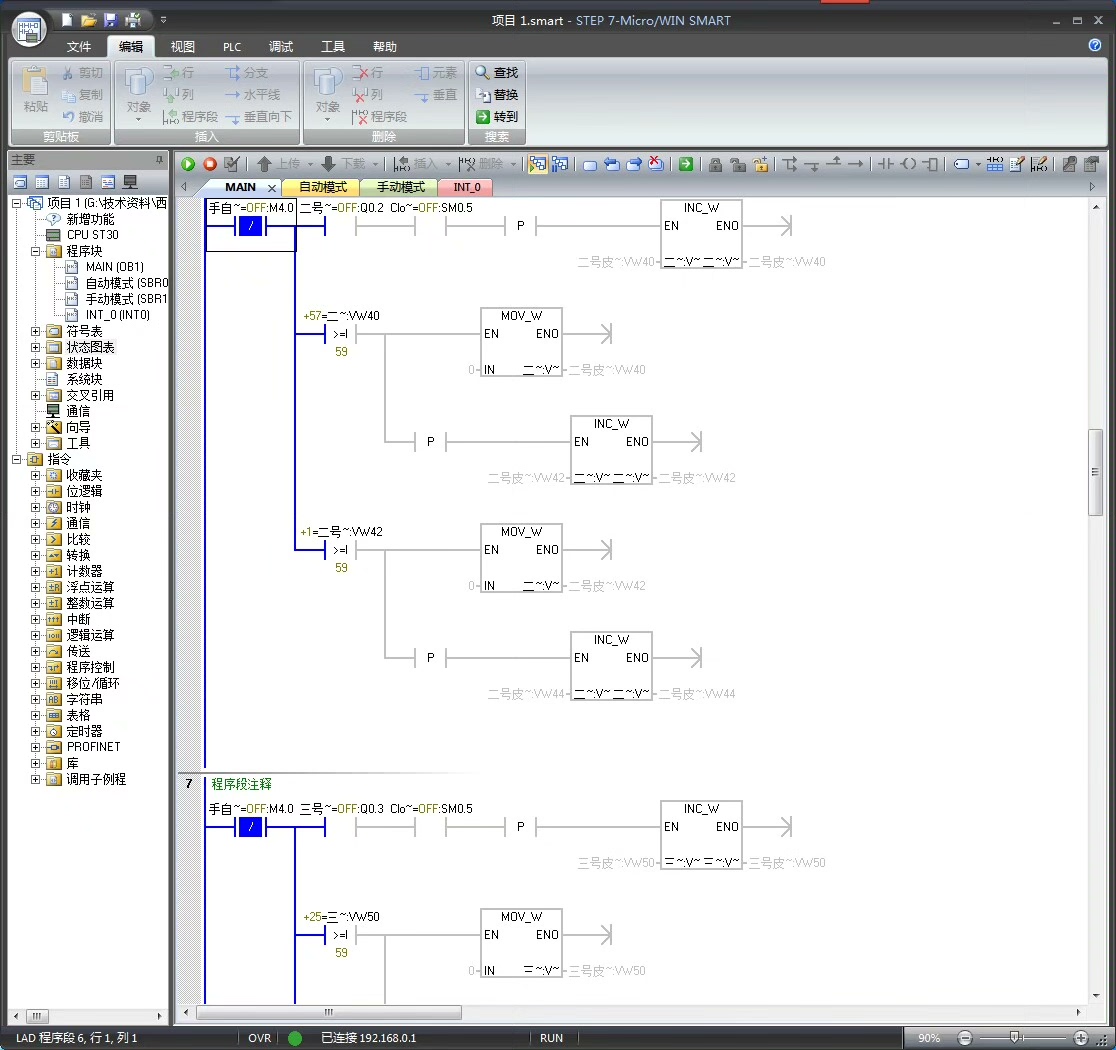 代码分析:当停止按钮按下,首先停止4#皮带机(R Q0.4, 1),然后通过定时器TON T40延时2秒,延时到后停止3#皮带机,依此类推,实现顺序停止。