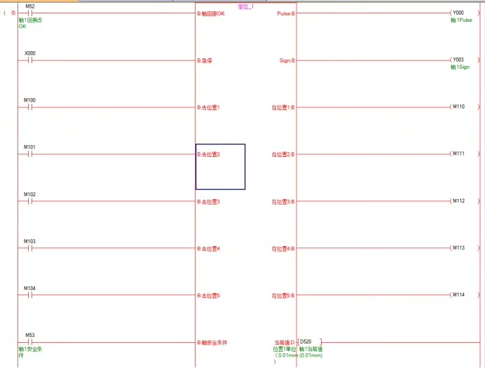 LD M8000 确保程序在 PLC 运行时就开始执行定位任务。调用 CALL P100 让程序跳转到定位 FB 块所在位置。而对 D 寄存器赋值则是设置定位所需的关键参数。目标位置决定了设备最终要到达的地方,速度参数影响运行快慢,加减速时间则保证设备启动和停止时的平稳,避免冲击。